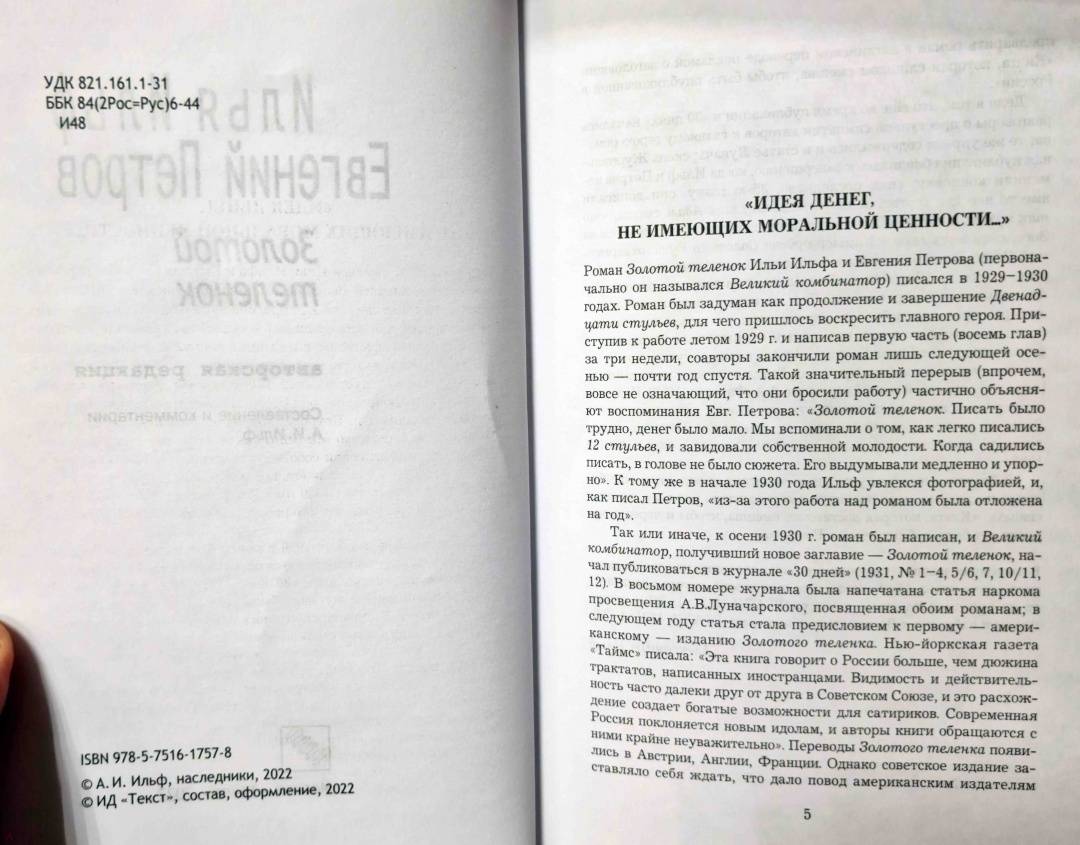 ОписаниеКнига 1. Двенадцать стульевАвторская редакция знаменитого романа Ильи Ильфа и Евгения Петрова, восстановленная Александрой Ильиничной Ильф. В текст романа возвращены фрагменты, опубликованные в журнале "30 дней" и в первом издании, в том числе две главы и несколько значительных эпизодов, которые по вкусовым или цензурным соображениям были опущены при последующих переизданиях, а также включен ряд фрагментов из рукописного и машинописного вариантов романа.Книга 2. Золотой теленокАвторская редакция романа Ильи Ильфа и Евгения Петрова, с приложением первоначальной концовки - главы "Адам сказал, что так нужно", в которой Остап Бендер женится на Зосе Синицкой.А также - впервые в полном объеме - планы, сюжетные разработки и наброски из архивной папки "Материалы к "Великому комбинатору"" с комментариями Александры Ильиничны Ильф и новые факты о творчестве знаменитых соавторов в заключительной статье "Одесские мотивы в романах Ильфа и Петрова".Книга 1. Двенадцать стульевАвторская редакция знаменитого романа Ильи Ильфа и Евгения Петрова, восстановленная Александрой Ильиничной Ильф. В текст романа возвращены фрагменты, опубликованные в журнале "30 дней" и в первом издании, в том числе две главы и несколько значительных эпизодов, которые по вкусовым или цензурным соображениям были опущены при последующих переизданиях, а также включен ряд фрагментов из рукописного и машинописного вариантов романа.Книга 2. Золотой теленокАвторская редакция романа Ильи Ильфа и Евгения Петрова, с приложением первоначальной концовки - главы "Адам сказал, что так нужно", в которой Остап Бендер женится на Зосе Синицкой.А также - впервые в полном объеме - планы, сюжетные разработки и наброски из архивной папки "Материалы к "Великому комбинатору"" с комментариями Александры Ильиничны Ильф и новые факты о творчестве знаменитых соавторов в заключительной статье "Одесские мотивы в романах Ильфа и Петрова".