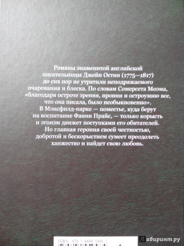 ОписаниеРоманы знаменитой английской писательницы Джейн Остин (1775-1817) до сих пор не утратили неподражаемого очарования и блеска. По словам Сомерсета Моэма, "благодаря остроте зрения, иронии и остроумию все, что она писала, было необыкновенно".В "Мэнсфилд-парке" - поместье, куда берут на воспитание Фанни Прайс, только корысть и эгоизм движет поступками его обитателей. Но главная героиня своей честностью, добротой и великодушием сумеет преодолеть ханжество и найдет свою любовь.Романы знаменитой английской писательницы Джейн Остин (1775-1817) до сих пор не утратили неподражаемого очарования и блеска. По словам Сомерсета Моэма, "благодаря остроте зрения, иронии и остроумию все, что она писала, было необыкновенно".В "Мэнсфилд-парке" - поместье, куда берут на воспитание Фанни Прайс, только корысть и эгоизм движет поступками его обитателей. Но главная героиня своей честностью, добротой и великодушием сумеет преодолеть ханжество и найдет свою любовь.