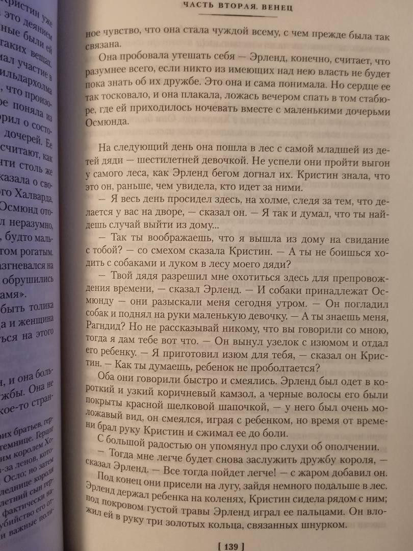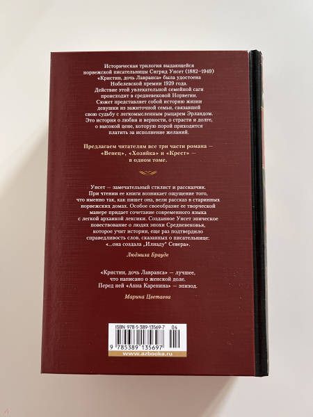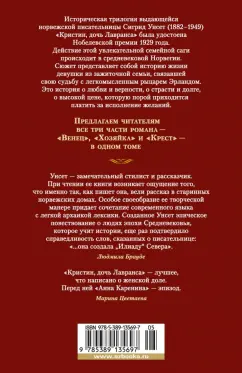 ОписаниеИсторическая трилогия выдающейся норвежской писательницы Сигрид Унсет (1882 - 1949) "Кристин, дочь Лавранса" была удостоена Нобелевской премии 1929 года. Действие этой увлекательной семейной саги происходит в средневековой Норвегии. Сюжет представляет собой историю жизни девушки из зажиточной семьи, связавшей свою судьбу с легкомысленным рыцарем Эрландом. Это история о любви и верности, о страсти и долге, о высокой цене, которую порой приходится платить за исполнение желаний.Предлагаем читателям впервые на русском все три части романа - "Венец", "Хозяйка" и "Крест" - в одном томе.Историческая трилогия выдающейся норвежской писательницы Сигрид Унсет (1882 - 1949) "Кристин, дочь Лавранса" была удостоена Нобелевской премии 1929 года. Действие этой увлекательной семейной саги происходит в средневековой Норвегии. Сюжет представляет собой историю жизни девушки из зажиточной семьи, связавшей свою судьбу с легкомысленным рыцарем Эрландом. Это история о любви и верности, о страсти и долге, о высокой цене, которую порой приходится платить за исполнение желаний.Предлагаем читателям впервые на русском все три части романа - "Венец", "Хозяйка" и "Крест" - в одном томе.