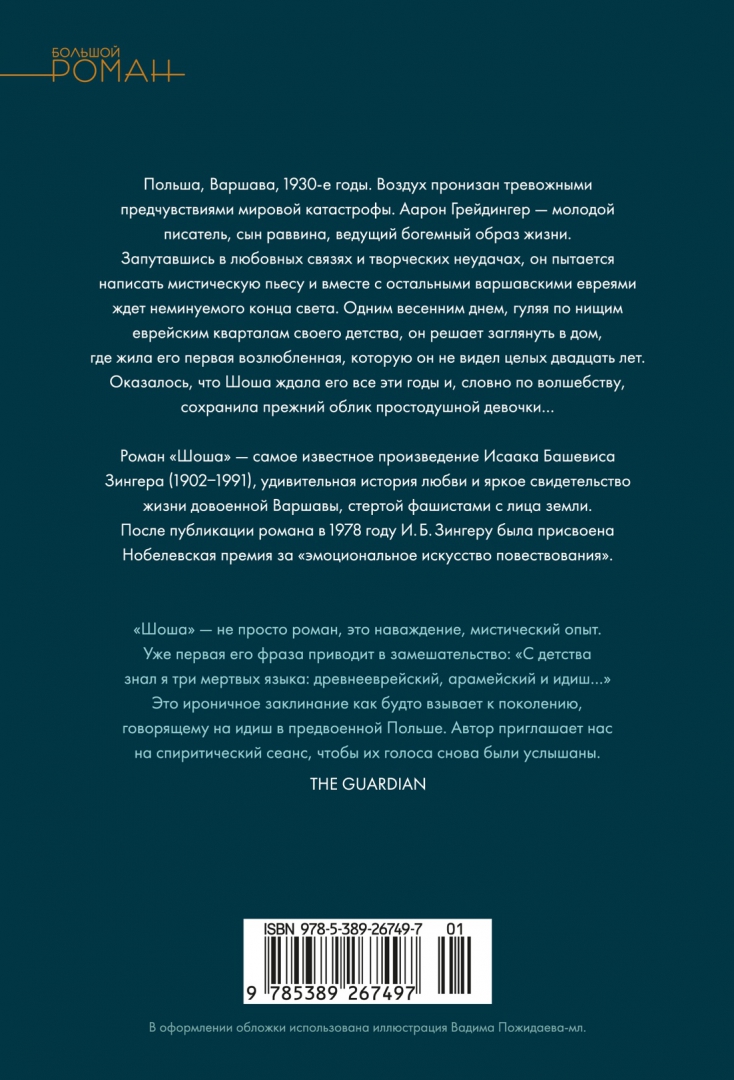 ОписаниеПольша, Варшава, 1930-е годы. Воздух пронизан тревожными предчувствиями мировой катастрофы. Аарон Грейдингер — молодой писатель, сын раввина, ведущий богемный образ жизни. Запутавшись в любовных связях и творческих неудачах, он пытается написать мистическую пьесу и вместе с остальными варшавскими евреями ждет неминуемого конца света. Одним весенним днем, гуляя по нищим еврейским кварталам своего детства, он решает заглянуть в дом, где жила его первая возлюбленная, которую он не видел целых двадцать лет. Оказалось, что Шоша ждала его все эти годы и, словно по волшебству, сохранила прежний облик простодушной девочки… Роман «Шоша» — самое известное произведение Исаака Башевиса Зингера (1902—1991), удивительная история любви и яркое свидетельство жизни довоенной Варшавы, стертой фашистами с лица земли. После публикации английской версии романа в 1978 году И. Б. Зингеру была присвоена Нобелевская премия за «эмоциональное искусство повествования». Первоначально текст выходил на идиш под названием «Экспедиции души», однако в процессе перевода на английский был значительно изменен и переработан автором, который в дальнейшем настаивал, чтобы именно по английской версии совершались переводы на другие языки. В настоящем издании роман «Шоша» представлен в классическом переводе с английского Нины Брумберг.СвернутьПольша, Варшава, 1930-е годы. Воздух пронизан тревожными предчувствиями мировой катастрофы. Аарон Грейдингер — молодой писатель, сын раввина, ведущий богемный образ жизни. Запутавшись в любовных связях и творческих неудачах, он пытается написать мистическую пьесу и вместе с остальными варшавскими евреями ждет неминуемого конца света. Одним весенним днем, гуляя по нищим еврейским кварталам своего детства, он решает заглянуть в дом, где жила его первая возлюбленная, которую он не видел целых двадцать лет. Оказалось, что Шоша ждала его все эти годы и, словно по волшебству, сохранила прежний облик простодушной девочки… Роман «Шоша» — самое известное произведение Исаака Башевиса Зингера (1902—1991), удивительная история любви и яркое свидетельство жизни довоенной Варшавы, стертой фашистами с лица земли. После публикации английской версии романа в 1978 году И. Б. Зингеру была присвоена Нобелевская премия за «эмоциональное искусство повествования». Первоначально текст выходил на идиш под названием «Экспедиции души», однако в процессе перевода на английский был значительно изменен и переработан автором, который в дальнейшем настаивал, чтобы именно по английской версии совершались переводы на другие языки. В настоящем издании роман «Шоша» представлен в классическом переводе с английского Нины Брумберг.СвернутьСвернуть