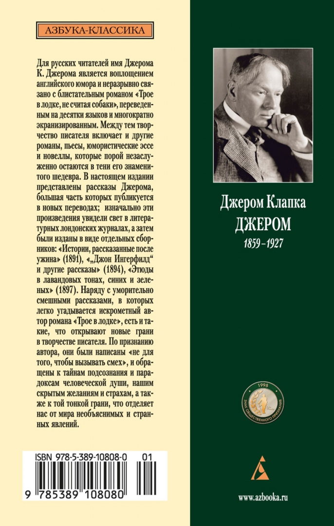 ОписаниеДля русских читателей имя Джерома К. Джерома является воплощением английского юмора и неразрывно связано с блистательным романом «Трое в лодке, не считая собаки», переведенным на десятки языков и многократно экранизированным. Между тем творчество писателя включает и другие романы, пьесы, юмористические эссе и новеллы, которые порой незаслуженно остаются в тени его знаменитого шедевра. В настоящем издании представлены рассказы Джерома, большая часть которых публикуется в новых переводах; изначально эти произведения увидели свет в литературных лондонских журналах, а затем были изданы в виде отдельных сборников: «Истории, рассказанные после ужина» (1891), «„Джон Ингерфилд“ и другие рассказы» (1894), «Этюды в лавандовых тонах, синих и зеленых» (1897). Наряду с уморительно смешными рассказами, в которых легко угадывается искрометный автор романа «Трое в лодке», есть и такие, что открывают новые грани в творчестве писателя. По признанию автора, они были написаны «не для того, чтобы вызывать смех», и обращены к тайнам подсознания и парадоксам человеческой души, нашим скрытым желаниям и страхам, а также к той тонкой грани, что отделяет нас от мира необъяснимых и странных явлений.СвернутьДля русских читателей имя Джерома К. Джерома является воплощением английского юмора и неразрывно связано с блистательным романом «Трое в лодке, не считая собаки», переведенным на десятки языков и многократно экранизированным. Между тем творчество писателя включает и другие романы, пьесы, юмористические эссе и новеллы, которые порой незаслуженно остаются в тени его знаменитого шедевра. В настоящем издании представлены рассказы Джерома, большая часть которых публикуется в новых переводах; изначально эти произведения увидели свет в литературных лондонских журналах, а затем были изданы в виде отдельных сборников: «Истории, рассказанные после ужина» (1891), «„Джон Ингерфилд“ и другие рассказы» (1894), «Этюды в лавандовых тонах, синих и зеленых» (1897). Наряду с уморительно смешными рассказами, в которых легко угадывается искрометный автор романа «Трое в лодке», есть и такие, что открывают новые грани в творчестве писателя. По признанию автора, они были написаны «не для того, чтобы вызывать смех», и обращены к тайнам подсознания и парадоксам человеческой души, нашим скрытым желаниям и страхам, а также к той тонкой грани, что отделяет нас от мира необъяснимых и странных явлений.СвернутьСвернуть