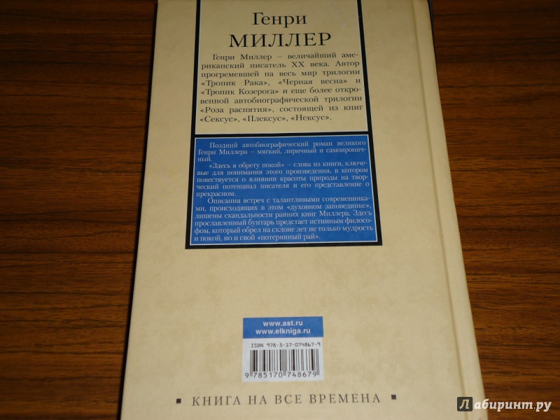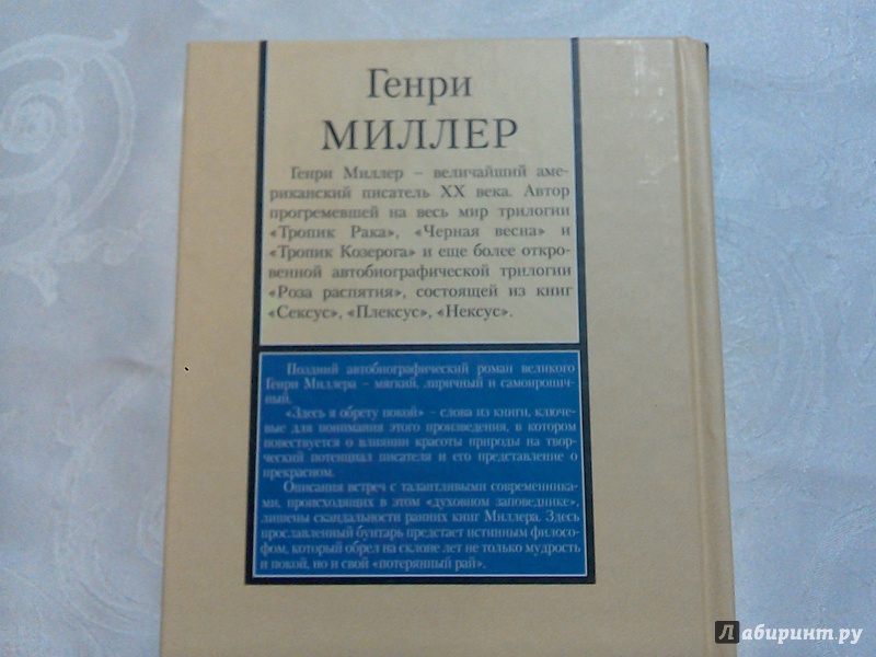 ОписаниеПоздний автобиографический роман великого Генри Миллера, - мягкий, лиричный и самоироничный. "Здесь я обрету покой", - слова из книги, ключевые для понимания этого произведения, в котором повествуется о влиянии красоты природы на творческий потенциал писателя и его представление о прекрасном. Описания встреч с талантливыми современниками, происходящих в этом "духовном заповеднике", лишены скандальности ранних книг Миллера. Здесь прославленный бунтарь предстает истинным философом, который обрел на склоне лет не только мудрость и покой, но и свой "потерянный рай".Поздний автобиографический роман великого Генри Миллера, - мягкий, лиричный и самоироничный. "Здесь я обрету покой", - слова из книги, ключевые для понимания этого произведения, в котором повествуется о влиянии красоты природы на творческий потенциал писателя и его представление о прекрасном. Описания встреч с талантливыми современниками, происходящих в этом "духовном заповеднике", лишены скандальности ранних книг Миллера. Здесь прославленный бунтарь предстает истинным философом, который обрел на склоне лет не только мудрость и покой, но и свой "потерянный рай".