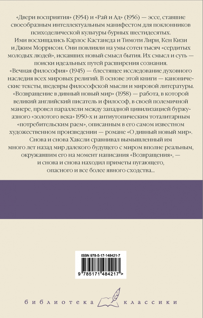 Описание"Двери восприятия" (1954) и "Рай и ад" (1956) - эссе, ставшие своеобразным интеллектуальным манифестом для поклонников психоделической культуры бурных шестидесятых. Ими восхищались Карлос Кастанеда и Тимоти Лири, Кен Кизи и Джим Моррисон. Они повлияли на умы сотен тысяч "сердитых молодых людей", искавших новый смысл бытия. Их смысл и суть - поиски идеальных путей расширения сознания."Вечная философия" (1945) - блестящее исследование духовного наследия всех мировых религий. В основе этой книги - канонические тексты, шедевры философской мысли и мировой литературы."Возвращение в дивный новый мир" (1958) - работа, в которой великий английский писатель и философ, в своей полемичной манере, провел параллели между западной цивилизацией буржуазного "золотого века" 1950-х и антиутопическим тоталитарным "потребительским раем", описанным в его самом известном художественном произведении - романе "О дивный новый мир". Снова и снова Хаксли сравнивал вымышленный им много лет назад мир далекого будущего с миром вполне реальным, окружавшим его на момент написания "Возвращения" - и снова и снова находил приметы пугающего, опасного и все более явного сходства…Свернуть"Двери восприятия" (1954) и "Рай и ад" (1956) - эссе, ставшие своеобразным интеллектуальным манифестом для поклонников психоделической культуры бурных шестидесятых. Ими восхищались Карлос Кастанеда и Тимоти Лири, Кен Кизи и Джим Моррисон. Они повлияли на умы сотен тысяч "сердитых молодых людей", искавших новый смысл бытия. Их смысл и суть - поиски идеальных путей расширения сознания."Вечная философия" (1945) - блестящее исследование духовного наследия всех мировых религий. В основе этой книги - канонические тексты, шедевры философской мысли и мировой литературы."Возвращение в дивный новый мир" (1958) - работа, в которой великий английский писатель и философ, в своей полемичной манере, провел параллели между западной цивилизацией буржуазного "золотого века" 1950-х и антиутопическим тоталитарным "потребительским раем", описанным в его самом известном художественном произведении - романе "О дивный новый мир". Снова и снова Хаксли сравнивал вымышленный им много лет назад мир далекого будущего с миром вполне реальным, окружавшим его на момент написания "Возвращения" - и снова и снова находил приметы пугающего, опасного и все более явного сходства…СвернутьСвернуть
