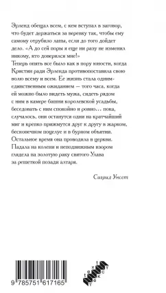 ОписаниеВ книгу вошла вторая часть трилогии лауреата Нобелевской премии, норвежской писательницы Сигрид Унсет "Кристин, дочь Лавранса" под названием "Хозяйка" (1921). В ней рассказывается о бедах и радостях семейной жизни главной героини Кристин с рыцарем Эрлендом в его усадьбе Хюсабю, где она теперь полновластная хозяйка, о рождении и воспитании сыновей и разлуке с родными, оставшимися в ее родовой усадьбе Йорюндгорд. Быть совершенно счастливой Кристин не дают волнения за любимого супруга, оказавшегося участником заговора против короля.Эрленд обещал всем, с кем вступал в заговор, что будет держаться за веревку так, чтобы ему самому отрубило лапы, если до того дойдет дело. "А до сей поры я еще ни разу не изменил никому, кто доверился мне!"Теперь опять все было как в пору юности, когда Кристин ради Эрленда противопоставила свою волю всему и всем. Ее жизнь стала одним-единственным ожиданием - того часа, когда ей можно было видеть мужа, сидеть рядом с ним в камере башни королевской усадьбы, беседовать с ним спокойно и ровно… пока, случалось, они останутся одни на кратчайший миг и крепко прижмутся друг к другу в жарком, бесконечном поцелуе и в бурном объятии. Остальное время она проводила в церкви. Падала на колени и неподвижным взором глядела на золотую раку святого Улава за решеткой позади алтаря.Сигрид УнсетСвернутьВ книгу вошла вторая часть трилогии лауреата Нобелевской премии, норвежской писательницы Сигрид Унсет "Кристин, дочь Лавранса" под названием "Хозяйка" (1921). В ней рассказывается о бедах и радостях семейной жизни главной героини Кристин с рыцарем Эрлендом в его усадьбе Хюсабю, где она теперь полновластная хозяйка, о рождении и воспитании сыновей и разлуке с родными, оставшимися в ее родовой усадьбе Йорюндгорд. Быть совершенно счастливой Кристин не дают волнения за любимого супруга, оказавшегося участником заговора против короля.Эрленд обещал всем, с кем вступал в заговор, что будет держаться за веревку так, чтобы ему самому отрубило лапы, если до того дойдет дело. "А до сей поры я еще ни разу не изменил никому, кто доверился мне!"Теперь опять все было как в пору юности, когда Кристин ради Эрленда противопоставила свою волю всему и всем. Ее жизнь стала одним-единственным ожиданием - того часа, когда ей можно было видеть мужа, сидеть рядом с ним в камере башни королевской усадьбы, беседовать с ним спокойно и ровно… пока, случалось, они останутся одни на кратчайший миг и крепко прижмутся друг к другу в жарком, бесконечном поцелуе и в бурном объятии. Остальное время она проводила в церкви. Падала на колени и неподвижным взором глядела на золотую раку святого Улава за решеткой позади алтаря.Сигрид УнсетСвернутьСвернуть