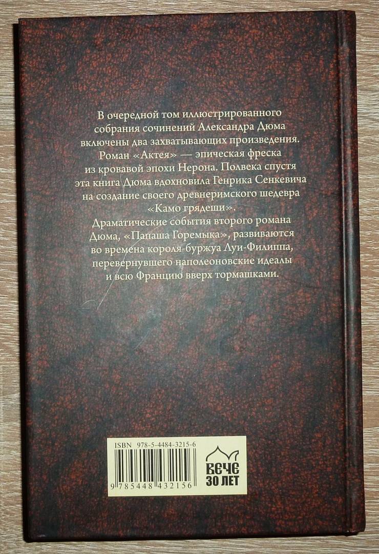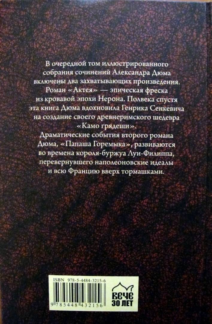 ОписаниеВ очередной том иллюстрированного собрания сочинений Александра Дюма включены два захватывающих произведения. Роман "Актея" - эпическая фреска из кровавой эпохи Нерона. Полвека спустя эта книга Дюма вдохновила Генрика Сенкевича на создание своего древнеримского шедевра "Камо грядеши". Драматические события второго романа Дюма, "Папаша Горемыка", развиваются во времена короля-буржуа Луи-Филиппа, перевернувшего наполеоновские идеалы и всю Францию вверх тормашками.В очередной том иллюстрированного собрания сочинений Александра Дюма включены два захватывающих произведения. Роман "Актея" - эпическая фреска из кровавой эпохи Нерона. Полвека спустя эта книга Дюма вдохновила Генрика Сенкевича на создание своего древнеримского шедевра "Камо грядеши". Драматические события второго романа Дюма, "Папаша Горемыка", развиваются во времена короля-буржуа Луи-Филиппа, перевернувшего наполеоновские идеалы и всю Францию вверх тормашками.