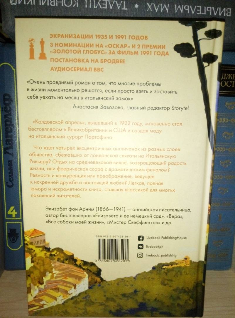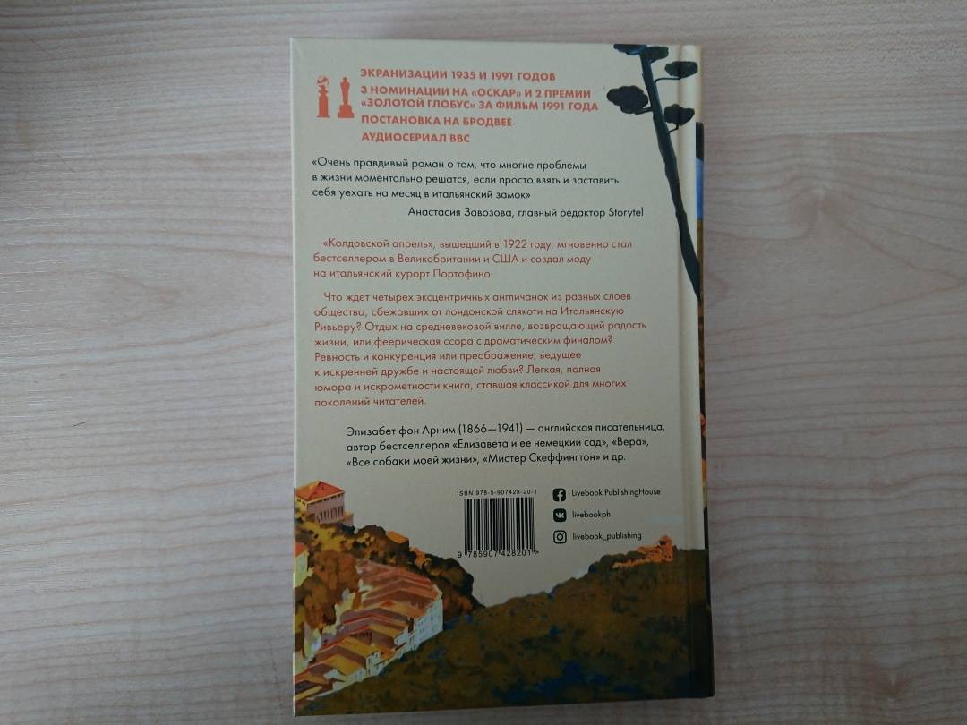Описание"Колдовской апрель", вышедший в 1922 году, мгновенно стал бестселлером в Великобритании и США и создал моду на итальянский курорт Портофино.Что ждет четырех эксцентричных англичанок из разных слоев общества, сбежавших от лондонской слякоти на Итальянскую Ривьеру? Отдых на средневековой вилле, возвращающий радость жизни, или феерическая ссора с драматическим финалом? Ревность и конкуренция или преображение, ведущее к искренней дружбе и настоящей любви?Легкая, полная юмора и искрометности книга, ставшая классикой для многих поколений читателей.Элизабет фон Арним (1866-1941) - английская писательница, автор бестселлеров "Елизавета и ее немецкий сад", "Вера", "Все собаки моей жизни", "Мистер Скеффингтон" и др."Колдовской апрель", вышедший в 1922 году, мгновенно стал бестселлером в Великобритании и США и создал моду на итальянский курорт Портофино.Что ждет четырех эксцентричных англичанок из разных слоев общества, сбежавших от лондонской слякоти на Итальянскую Ривьеру? Отдых на средневековой вилле, возвращающий радость жизни, или феерическая ссора с драматическим финалом? Ревность и конкуренция или преображение, ведущее к искренней дружбе и настоящей любви?Легкая, полная юмора и искрометности книга, ставшая классикой для многих поколений читателей.Элизабет фон Арним (1866-1941) - английская писательница, автор бестселлеров "Елизавета и ее немецкий сад", "Вера", "Все собаки моей жизни", "Мистер Скеффингтон" и др.