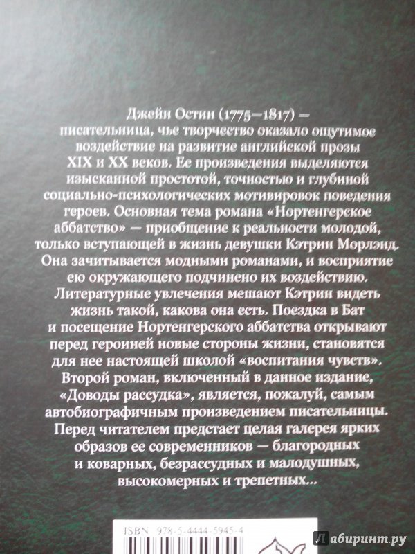 ОписаниеДжейн Остин (1775-1817) - писательница, чье творчество оказало ощутимое воздействие на развитие английской прозы XIX и XX веков. Ее произведения выделяются изысканной простотой, точностью и глубиной социально-психологических мотивировок поведения героев. Основная тема романа "Нортенгерское аббатство" - приобщение к реальности молодой, только вступающей в жизнь девушки Кэтрин Морлэнд. Она зачитывается модными романами, и восприятие ею окружающего подчинено их воздействию. Литературные увлечения мешают Кэтрин видеть жизнь такой, какова она есть. Поездка в Бат и посещение Нортенгерского аббатства открывают перед героиней новые стороны жизни, становятся для нее настоящей школой "воспитания чувств". Второй роман, включенный в данное издание, "Доводы рассудка", является, пожалуй, самым автобиографичным произведением писательницы. Перед читателем предстает целая галерея ярких образов ее современников - благородных и коварных, безрассудных и малодушных, высокомерных и трепетных…Джейн Остин (1775-1817) - писательница, чье творчество оказало ощутимое воздействие на развитие английской прозы XIX и XX веков. Ее произведения выделяются изысканной простотой, точностью и глубиной социально-психологических мотивировок поведения героев. Основная тема романа "Нортенгерское аббатство" - приобщение к реальности молодой, только вступающей в жизнь девушки Кэтрин Морлэнд. Она зачитывается модными романами, и восприятие ею окружающего подчинено их воздействию. Литературные увлечения мешают Кэтрин видеть жизнь такой, какова она есть. Поездка в Бат и посещение Нортенгерского аббатства открывают перед героиней новые стороны жизни, становятся для нее настоящей школой "воспитания чувств". Второй роман, включенный в данное издание, "Доводы рассудка", является, пожалуй, самым автобиографичным произведением писательницы. Перед читателем предстает целая галерея ярких образов ее современников - благородных и коварных, безрассудных и малодушных, высокомерных и трепетных…