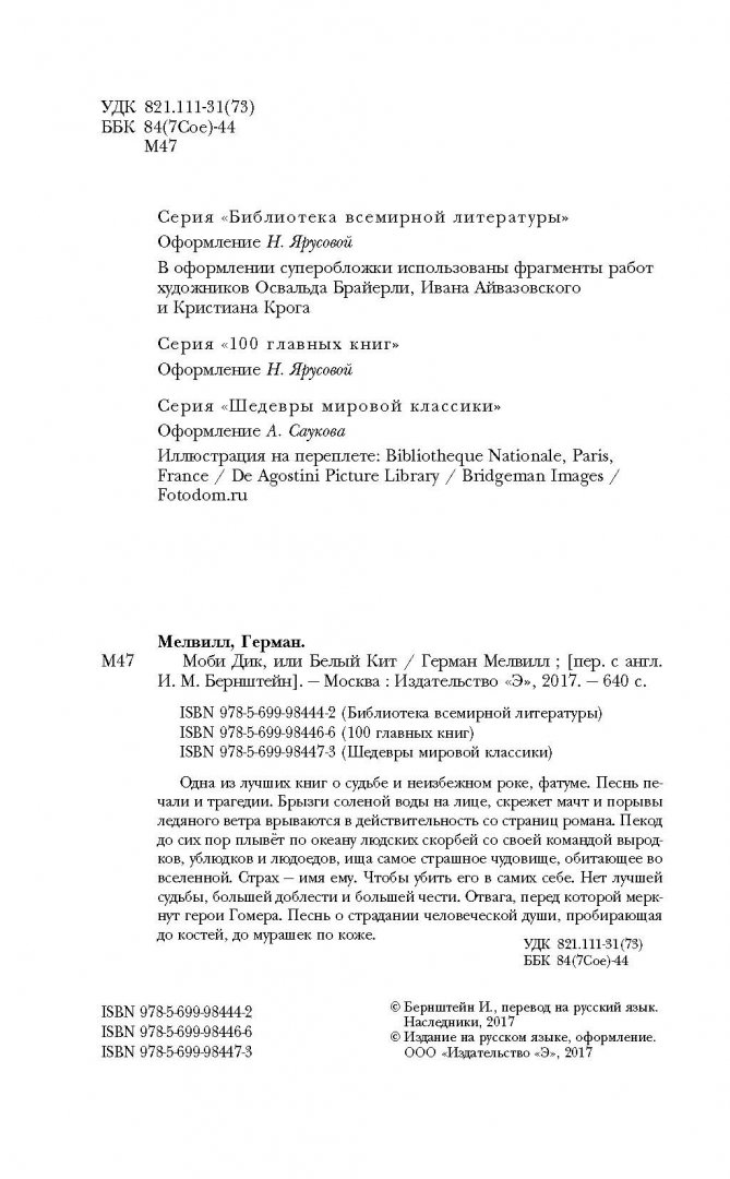 ОписаниеОдна из лучших книг о судьбе и неизбежном роке, фатуме. Песнь печали и трагедии. Брызги соленой воды на лице, скрежет мачт и порывы ледяного ветра врываются в действительность со страниц романа. Пекод до сих пор плывёт по океану людских скорбей со своей командой выродков, ублюдков и людоедов, ища самое страшное чудовище, обитающее во вселенной. Страх - имя ему. Чтобы убить его в самих себе. Нет лучшей судьбы, большей доблести и большей чести. Отвага, перед которой меркнут герои Гомера. Песнь о страдании человеческой души, пробирающая до костей, до мурашек по коже.Одна из лучших книг о судьбе и неизбежном роке, фатуме. Песнь печали и трагедии. Брызги соленой воды на лице, скрежет мачт и порывы ледяного ветра врываются в действительность со страниц романа. Пекод до сих пор плывёт по океану людских скорбей со своей командой выродков, ублюдков и людоедов, ища самое страшное чудовище, обитающее во вселенной. Страх - имя ему. Чтобы убить его в самих себе. Нет лучшей судьбы, большей доблести и большей чести. Отвага, перед которой меркнут герои Гомера. Песнь о страдании человеческой души, пробирающая до костей, до мурашек по коже.