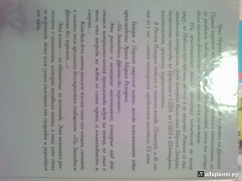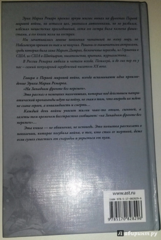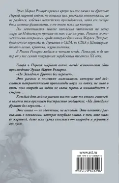 ОписаниеГоворя о Первой мировой войне, всегда вспоминают одно произведение Эриха Марии Ремарка."На Западном фронте без перемен".Это рассказ о немецких мальчишках, которые под действием патриотической пропаганды идут на войну, не зная о том, что впереди их ждет не слава героев, а инвалидность и смерть…Каждый день войны уносит жизни чьих-то отцов, сыновей, а газеты тем временем бесстрастно сообщают: "на Западном фронте без перемен"…Эта книга - не обвинение, не исповедь. Это попытка рассказать о поколении, которое погубила война, о тех, кто стал ее жертвой, даже если сумел спастись от снарядов и укрыться от пули.Говоря о Первой мировой войне, всегда вспоминают одно произведение Эриха Марии Ремарка."На Западном фронте без перемен".Это рассказ о немецких мальчишках, которые под действием патриотической пропаганды идут на войну, не зная о том, что впереди их ждет не слава героев, а инвалидность и смерть…Каждый день войны уносит жизни чьих-то отцов, сыновей, а газеты тем временем бесстрастно сообщают: "на Западном фронте без перемен"…Эта книга - не обвинение, не исповедь. Это попытка рассказать о поколении, которое погубила война, о тех, кто стал ее жертвой, даже если сумел спастись от снарядов и укрыться от пули.