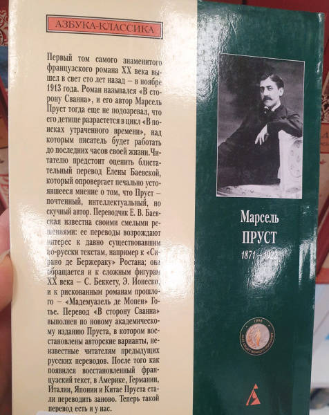 ОписаниеПервый том самого знаменитого французского романа ХХ века вышел в свет сто лет назад – в ноябре 1913 года. Роман назывался «В сторону Сванна», и его автор Марсель Пруст тогда еще не подозревал, что его детище разрастется в цикл «В поисках утраченного времени», над которым писатель будет работать до последних часов своей жизни. Читателю предстоит оценить блистательный перевод Елены Баевской, который опровергает печально устоявшееся мнение о том, что Пруст — почтенный, интеллектуальный, но скучный автор.Первый том самого знаменитого французского романа ХХ века вышел в свет сто лет назад – в ноябре 1913 года. Роман назывался «В сторону Сванна», и его автор Марсель Пруст тогда еще не подозревал, что его детище разрастется в цикл «В поисках утраченного времени», над которым писатель будет работать до последних часов своей жизни. Читателю предстоит оценить блистательный перевод Елены Баевской, который опровергает печально устоявшееся мнение о том, что Пруст — почтенный, интеллектуальный, но скучный автор.