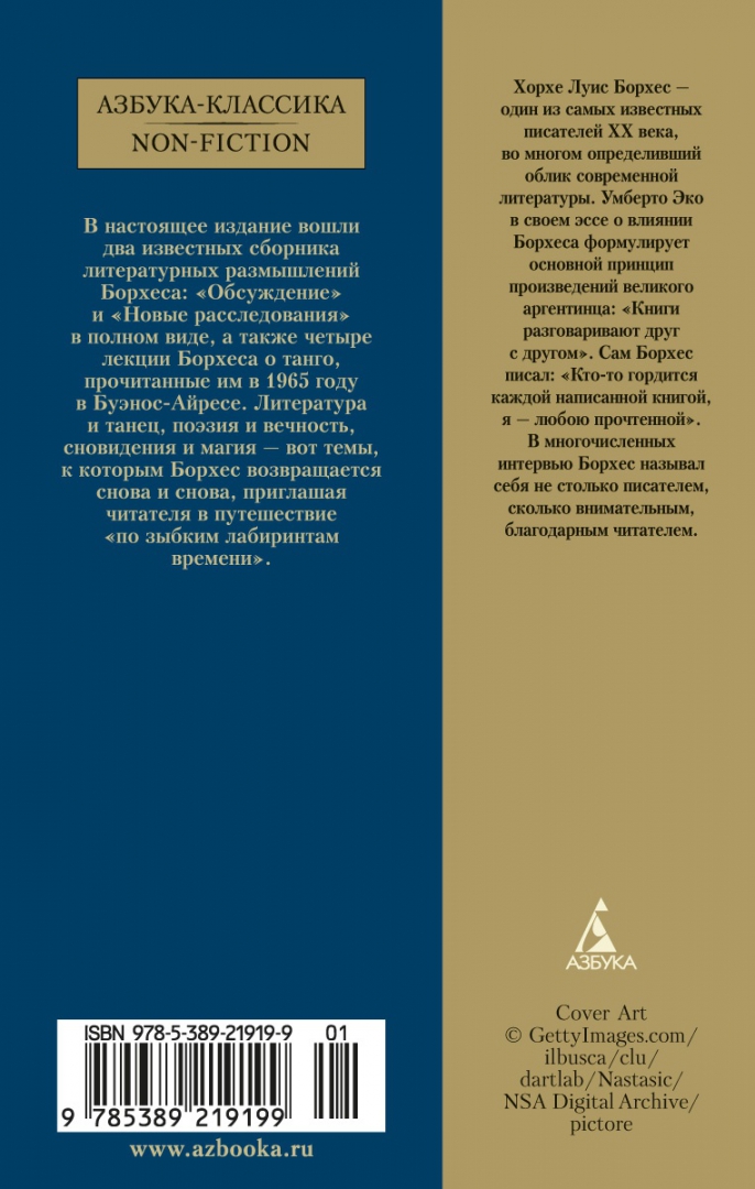 ОписаниеХорхе Луис Борхес — один из самых известных писателей ХХ века, во многом определивший облик современной литературы. Умберто Эко в своем эссе о влиянии Борхеса формулирует основной принцип произведений великого аргентинца: «Книги разговаривают друг с другом». Сам Борхес писал: «Кто-то гордится каждой написанной книгой, я — любою прочтенной». В многочисленных интервью Борхес называл себя не столько писателем, сколько внимательным, благодарным читателем. В настоящее издание вошли два известных сборника литературных размышлений Борхеса: «Обсуждение» и «Новые расследования» в полном виде, а также четыре лекции Борхеса о танго, прочитанные им в 1965 году в Буэнос-Айресе. Литература и танец, поэзия и вечность, сновидения и магия — вот темы, к которым Борхес возвращается снова и снова, приглашая читателя в путешествие «по зыбким лабиринтам времени».Хорхе Луис Борхес — один из самых известных писателей ХХ века, во многом определивший облик современной литературы. Умберто Эко в своем эссе о влиянии Борхеса формулирует основной принцип произведений великого аргентинца: «Книги разговаривают друг с другом». Сам Борхес писал: «Кто-то гордится каждой написанной книгой, я — любою прочтенной». В многочисленных интервью Борхес называл себя не столько писателем, сколько внимательным, благодарным читателем. В настоящее издание вошли два известных сборника литературных размышлений Борхеса: «Обсуждение» и «Новые расследования» в полном виде, а также четыре лекции Борхеса о танго, прочитанные им в 1965 году в Буэнос-Айресе. Литература и танец, поэзия и вечность, сновидения и магия — вот темы, к которым Борхес возвращается снова и снова, приглашая читателя в путешествие «по зыбким лабиринтам времени».