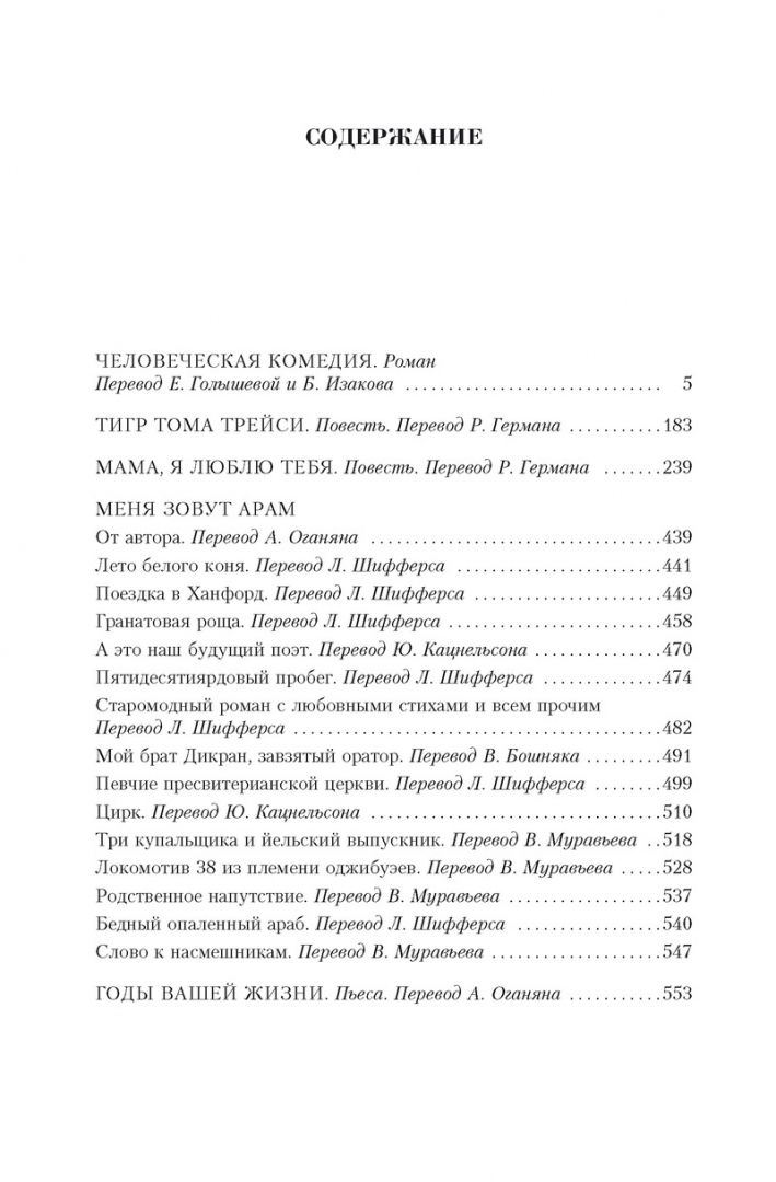 В настоящее издание вошел роман «Человеческая комедия», повести «Тигр Тома Трейси» и «Мама, я тебя люблю», сборник рассказов «Меня зовут Арам», а также самая известная пьеса Сарояна «Годы вашей жизни», принесшая автору престижную Пулитцеровскую премию. -