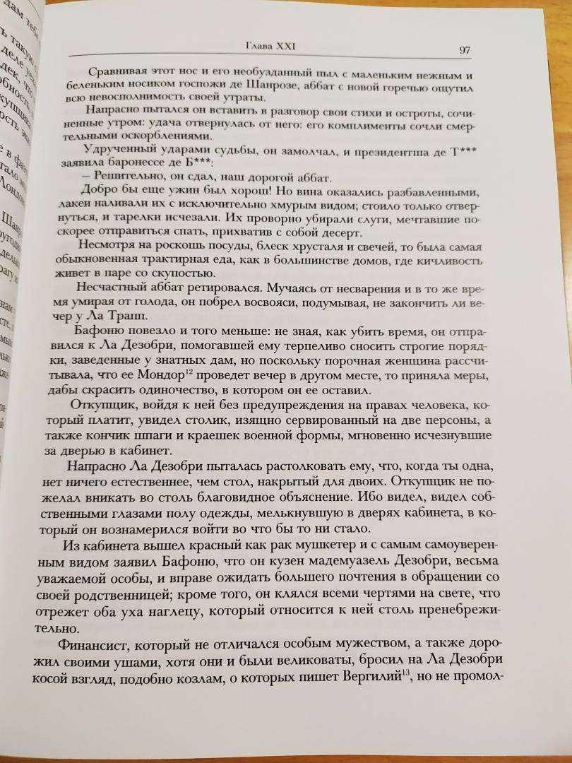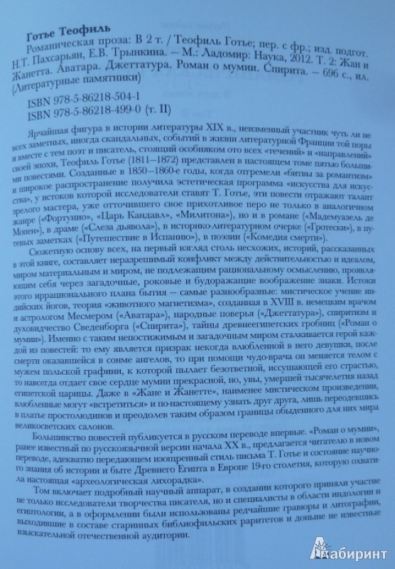 ОписаниеЯрчайшая фигура в истории литературы XIX в., неизменный участник чуть ли не всех заметных, иногда скандальных, событий в жизни литературной Франции той поры и вместе с тем поэт и писатель, стоящий особняком ото всех "течений" и "направлений" своей эпохи, Теофиль Готье (1811-1872) представлен в настоящем томе пятью большими повестями. Созданные в 1850-1860-е годы, когда отгремели "битвы за романтизм" и широкое распространение получила эстетическая программа "искусства для искусства", у истоков которой исследователи ставят Т. Готье, эти повести отражают талант зрелого мастера, уже отточившего свое прихотливое перо не только в аналогичном жанре ("Фортунио", "Царь Кандавл", "Милитона"), но ив романе ("Мадемуазель де Мопен"), в драме ("Слеза дьявола"), в историко-литераутрном очерке ("Гротески"), в путевых заметках ("Путешествие в Испанию"), в поэзии ("Комедия смерти").Сюжетную основу всех, на первый взгляд столь несхожих, историй, рассказанных в этой книге, составляет неразрешимый конфликт между действительностью и идеалом, миром материальным и миром, не подлежащим рациональному осмыслению, проявляющим себя через загадочные, роковые и будоражащие воображение знаки. Истоки этого иррационального плана бытия - самые разнообразные мистические учения индийских йогов, теория "животного магнетизма", созданная в XVIII в. Немецким врачом и астрологом Месмером ("Аватара"), народные поверья ("Джеттатура"), спиритизм и духовидчество Сведенборга ("Спирита"), тайны древнеегипетских гробниц ("Роман о мумии"). Именно с таким непостижимым и загадочным миром сталкивается герой каждой из повестей: то ему является призрак некогда влюбленной в него девушки, после смерти оказавшейся в сонме ангелов, то при помощи чуда-врача он меняется телом с мужем польской графини, к которой пылает безответной, иссушающей его страстью, то навсегда отдает свое сердце мумии прекрасной, но, увы, умершей тысячелетия назад египетской царицы. Даже в "Жане и Жанетте", наименее мистическом произведении, влюбленные могут "встретиться" и по-настоящему узнать друг друга, лишь переодевшись в платье простолюдинов и преодолев таким образом границы обыденного для них мира великосветских салонов.Большинство повестей публикуется в русском переводе впервые. "Роман о мумии", ранее известный по русскоязычной версии начала XX в., предлагается читателю в новом переводе, адекватно передающем изощренный стиль письма Т. Готье и состояние научного знания об истории и быте Древнего Египта в Европе 19-го столетия, которую охватила настоящая "археологическая лихорадка".Том включает подробный научный аппарат, в создании которого приняли участие не только исследователи творчества писателя, но и специалисты в области индологии и египтологии, а в оформлении были использованы редчайшие гравюры и литографии, выходившие в составе старинных библиофильских раритетов и доныне не известные взыскательной отечественной аудитории.СвернутьЯрчайшая фигура в истории литературы XIX в., неизменный участник чуть ли не всех заметных, иногда скандальных, событий в жизни литературной Франции той поры и вместе с тем поэт и писатель, стоящий особняком ото всех "течений" и "направлений" своей эпохи, Теофиль Готье (1811-1872) представлен в настоящем томе пятью большими повестями. Созданные в 1850-1860-е годы, когда отгремели "битвы за романтиз