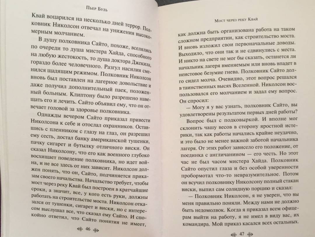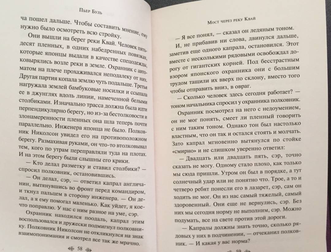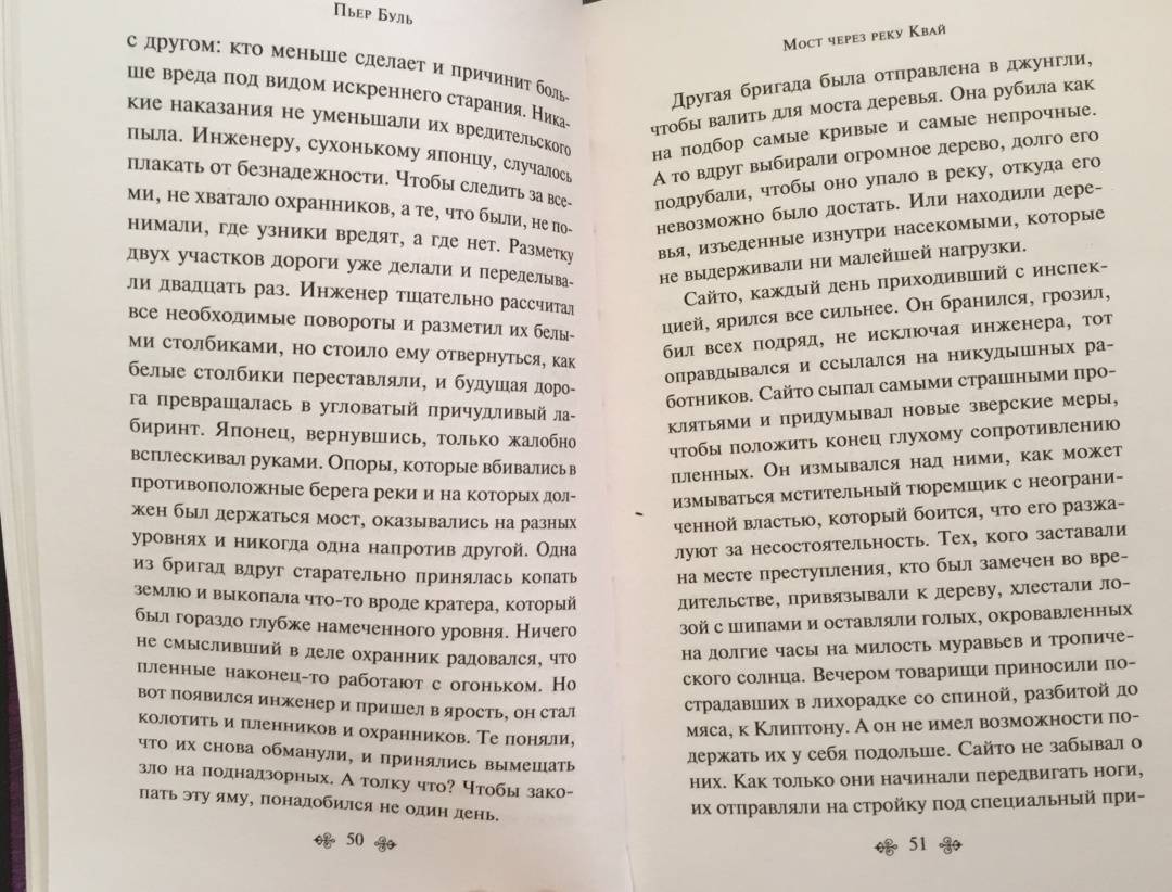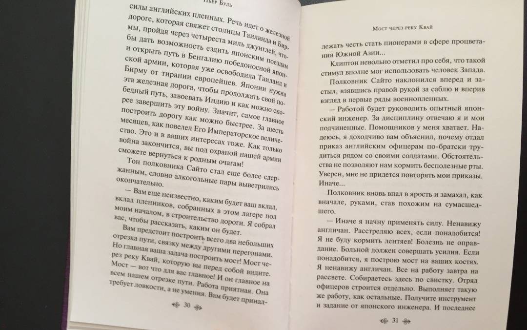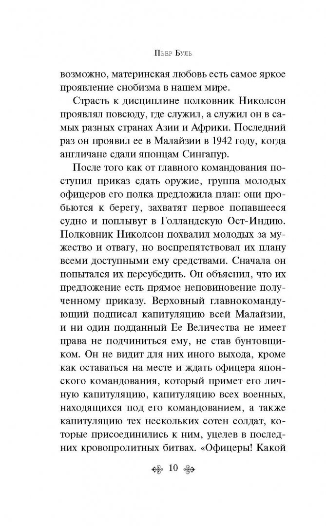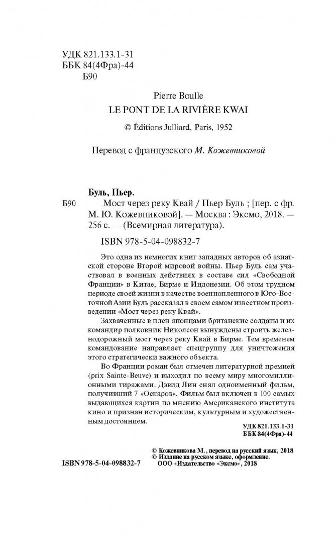 ОписаниеЭто одна из немногих книг западных авторов об азиатской стороне Второй Мировой войны. Пьер Буль сам участвовал в военных действиях в составе сил "Свободной Франции" в Китае, Бирме и Индонезии. Об этом трудном периоде своей жизни в качестве военнопленного в Юго-Восточной Азии Буль рассказал в своём самом известном произведении "Мост через реку Квай". Захваченные в плен японцами британские солдаты и их командир полковник Николсон вынуждены строить железнодорожный мост через реку Квай в Бирме. Тем временем командование направляет спецгруппу для уничтожения этого стратегически важного объекта. Во Франции роман был отмечен литературной премией (prix Sainte-Beuve) и выходил по всему миру многомиллионными тиражами. Дэвид Лин снял одноименный фильм, получивший 7 "Оскаров". Фильм был включен в 100 самых выдающихся картин по мнению Американского института кино и признан историческим, культурным и художественным достоянием.Это одна из немногих книг западных авторов об азиатской стороне Второй Мировой войны. Пьер Буль сам участвовал в военных действиях в составе сил "Свободной Франции" в Китае, Бирме и Индонезии. Об этом трудном периоде своей жизни в качестве военнопленного в Юго-Восточной Азии Буль рассказал в своём самом известном произведении "Мост через реку Квай". Захваченные в плен японцами британские солдаты и их командир полковник Николсон вынуждены строить железнодорожный мост через реку Квай в Бирме. Тем временем командование направляет спецгруппу для уничтожения этого стратегически важного объекта. Во Франции роман был отмечен литературной премией (prix Sainte-Beuve) и выходил по всему миру многомиллионными тиражами. Дэвид Лин снял одноименный фильм, получивший 7 "Оскаров". Фильм был включен в 100 самых выдающихся картин по мнению Американского института кино и признан историческим, культурным и художественным достоянием.