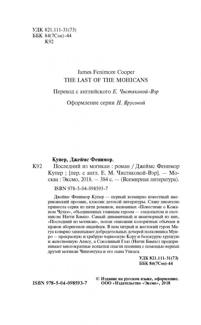 Объем, стр. 384 ISBN 978-5-04-098593-7 Автор Купер Джеймс Фенимор, Чистякова-Вэр Евгения Михайловна Переводчик Чистякова-Вэр Евгения Михайловна Серия Всемирная литература Минимальный возраст 16+ Год издания книги 2018 Тип обложки Твердый переплет Иллюстрации Без иллюстраций Вес, г 294г Размеры 207х135х27 мм - Отзывы