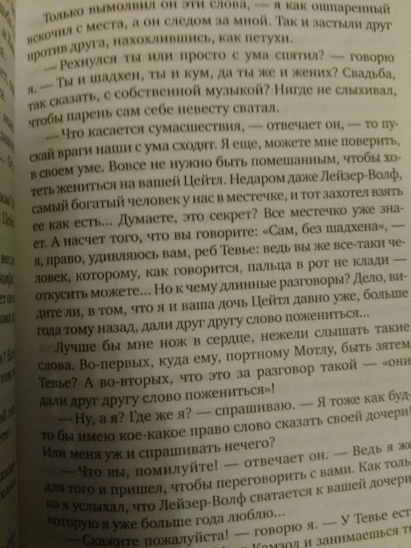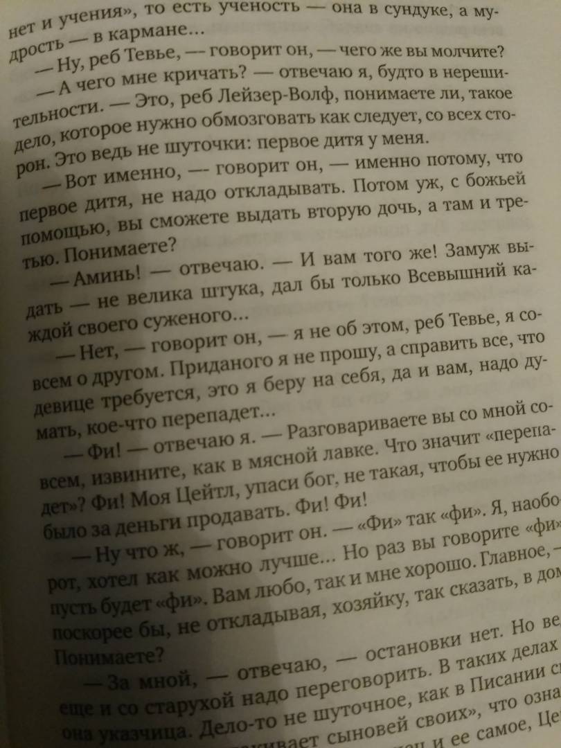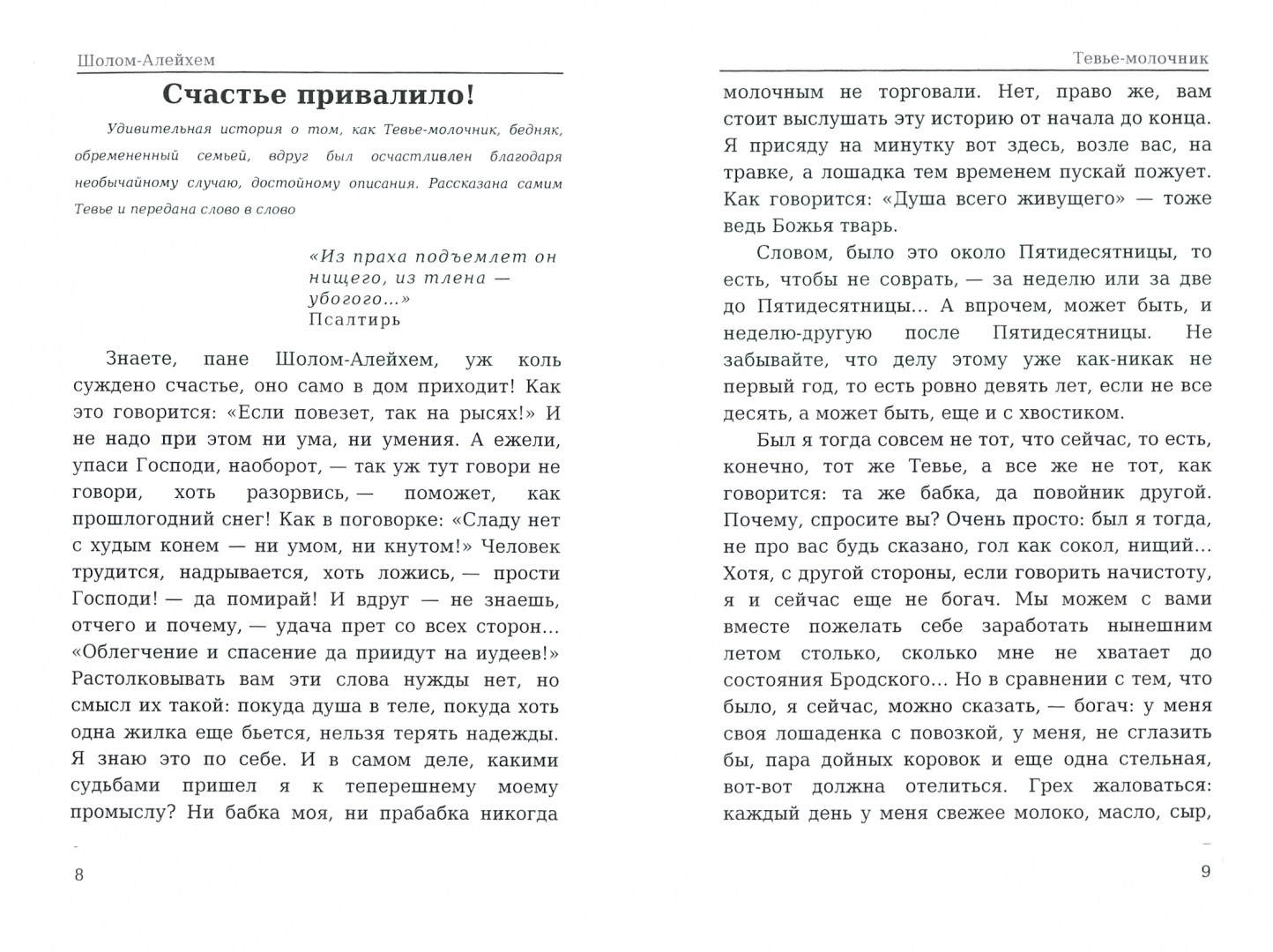 ОписаниеВ книге «Тевье-молочник» (1894) представлена серия рассказов-монологов в блестящем переводе с идиш Михаила Абрамовича Шамбадала (1891-1964). Под таким названием она публиковалась в периодической печати в 1894-1914 годах. Произведения из этого сборника не раз экранизировали, по ним было создано множество театральных постановок и мюзиклов. Это неудивительно — на этих страницах открывается потрясающий воображение, живой и объемный мир Шолома-Алейхема, мир давно уже исчезнувших еврейских местечек, смятых жестоким XX веком.В книге «Тевье-молочник» (1894) представлена серия рассказов-монологов в блестящем переводе с идиш Михаила Абрамовича Шамбадала (1891-1964). Под таким названием она публиковалась в периодической печати в 1894-1914 годах. Произведения из этого сборника не раз экранизировали, по ним было создано множество театральных постановок и мюзиклов. Это неудивительно — на этих страницах открывается потрясающий воображение, живой и объемный мир Шолома-Алейхема, мир давно уже исчезнувших еврейских местечек, смятых жестоким XX веком.