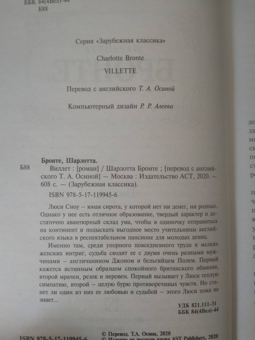 Объем, стр. 608 ISBN 978-5-17-119945-6 Автор Бронте Шарлотта, Осина Т. А. Переводчик Осина Т. А. Серия Зарубежная классика Минимальный возраст 12+ Год издания книги 2020 Тип обложки Твердый переплет Иллюстрации Без иллюстраций Вес, г 426г Размеры 206х135х28 мм - Отзывы