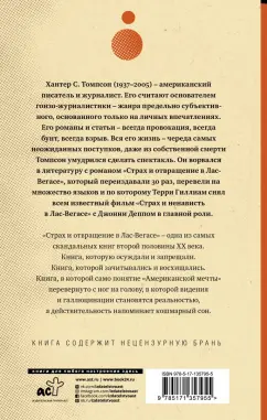 Описание"Страх и отвращение в Лас-Вегасе" – одна из самых скандальных книг второй половины ХХ века. Книга, которую осуждали и запрещали. Книга, которой зачитывались и восхищались. Книга, в которой само понятие "Американской мечты" перевернуто с ног на голову, в которой видения и галлюцинации становятся реальностью, а действительность напоминает кошмарный сон."Страх и отвращение в Лас-Вегасе" – одна из самых скандальных книг второй половины ХХ века. Книга, которую осуждали и запрещали. Книга, которой зачитывались и восхищались. Книга, в которой само понятие "Американской мечты" перевернуто с ног на голову, в которой видения и галлюцинации становятся реальностью, а действительность напоминает кошмарный сон.