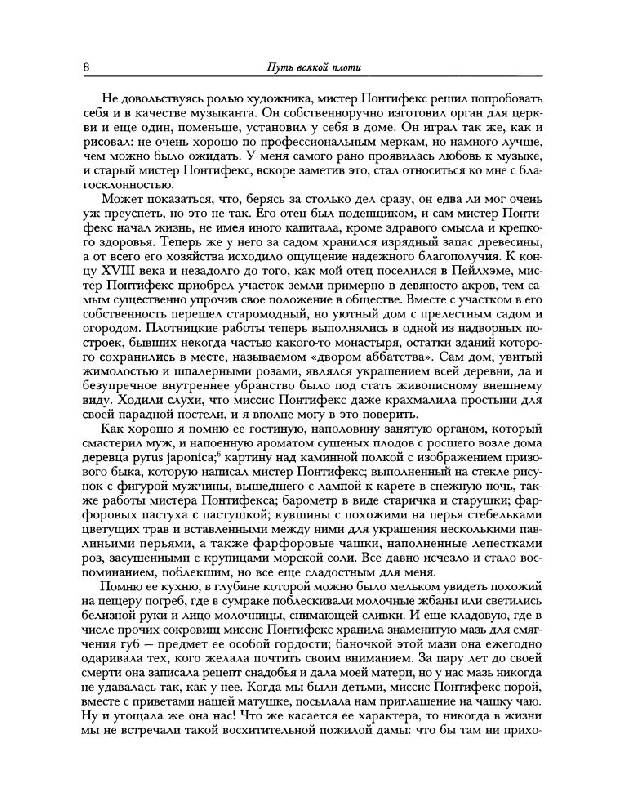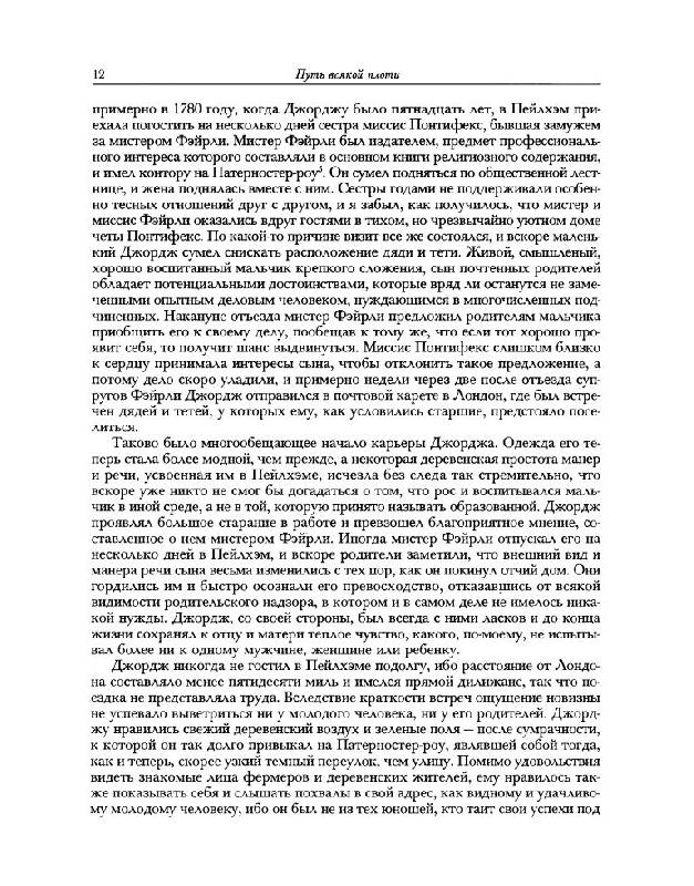ОписаниеВ английской литературе второй половины XIX в. Самуэлю Батлеру (1835-1902) принадлежит видное место. В жанре фантастического гротеска он возродил свифтовскую традицию, а в жанре романа воспитания предвосхитил тенденции, в полной мере развившиеся в европейской психологической прозе XX в. При создании "Пути всякой плоти" с немыслимой для того времени откровенностью писатель использовал личный жизненный опыт. Автобиографичность придает его повествованию особую остроту. В романе прослеживается формирование характера и духовное становление сына священника. Перед читателем проходят картины печального, искалеченного деспотичным произволом воспитателей детства главного героя, полной лишений и разочарований юности и, наконец, зрелости - поры, когда он обретает себя в творческом труде - писательской деятельности.Огромная эрудиция автора и мастерское владение словом позволяют ему искусно вплетать в ткань повествования и в речи героев библейские, шекспировские и другие классические цитаты и аллюзии, очень часто преподнося их так, что всем известные, расхожие фразы начинают сверкать новыми красками. Не менее изящны и собственные парадоксы и аллегории писателя. Умелое сочетание всех этих приемов позволило создать один из лучших викторианских романов, где оригинальные философские размышления соседствуют с яркими жанровыми сценами, а разящая сатира и едкая ирония - с мягким, чисто английским юмором.СвернутьВ английской литературе второй половины XIX в. Самуэлю Батлеру (1835-1902) принадлежит видное место. В жанре фантастического гротеска он возродил свифтовскую традицию, а в жанре романа воспитания предвосхитил тенденции, в полной мере развившиеся в европейской психологической прозе XX в. При создании "Пути всякой плоти" с немыслимой для того времени откровенностью писатель использовал личный жизненный опыт. Автобиографичность придает его повествованию особую остроту. В романе прослеживается формирование характера и духовное становление сына священника. Перед читателем проходят картины печального, искалеченного деспотичным произволом воспитателей детства главного героя, полной лишений и разочарований юности и, наконец, зрелости - поры, когда он обретает себя в творческом труде - писательской деятельности.Огромная эрудиция автора и мастерское владение словом позволяют ему искусно вплетать в ткань повествования и в речи героев библейские, шекспировские и другие классические цитаты и аллюзии, очень часто преподнося их так, что всем известные, расхожие фразы начинают сверкать новыми красками. Не менее изящны и собственные парадоксы и аллегории писателя. Умелое сочетание всех этих приемов позволило создать один из лучших викторианских романов, где оригинальные философские размышления соседствуют с яркими жанровыми сценами, а разящая сатира и едкая ирония - с мягким, чисто английским юмором.СвернутьСвернуть