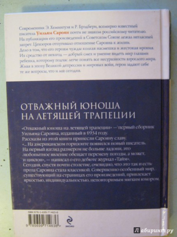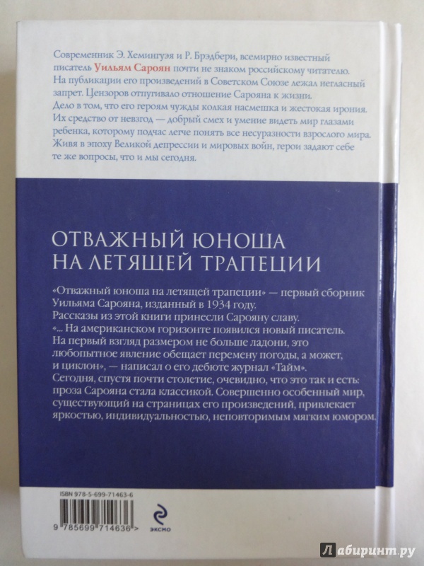 Описание"Отважный юноша на летящей трапеции" - первый сборник Уильяма Сарояна, изданный в 1934 году. Рассказы из этой книги принесли Сарояну славу. "… на американском горизонте появился новый писатель. На первый взгляд, размером не больше ладони, это любопытное явление обещает перемену погоды, а может, и циклон", - написал о его дебюте журнал "Тайм". Сегодня, спустя почти столетие, очевидно, что это так и есть: проза Сарояна стала классикой. Совершенно особенный мир, существующий на страницах его произведений, привлекает яркостью, индивидуальностью, неповторимым мягким юмором."Отважный юноша на летящей трапеции" - первый сборник Уильяма Сарояна, изданный в 1934 году. Рассказы из этой книги принесли Сарояну славу. "… на американском горизонте появился новый писатель. На первый взгляд, размером не больше ладони, это любопытное явление обещает перемену погоды, а может, и циклон", - написал о его дебюте журнал "Тайм". Сегодня, спустя почти столетие, очевидно, что это так и есть: проза Сарояна стала классикой. Совершенно особенный мир, существующий на страницах его произведений, привлекает яркостью, индивидуальностью, неповторимым мягким юмором.