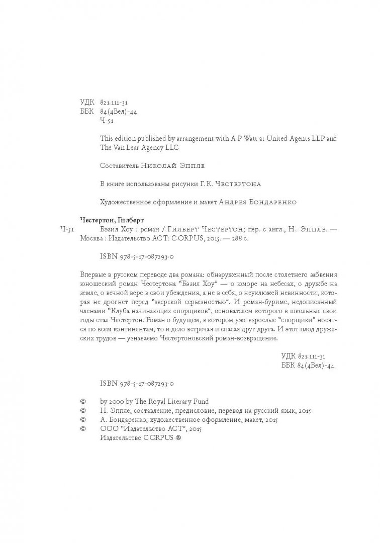ОписаниеВпервые в русском переводе два романа: обнаруженный после столетнего забвения юношеский роман Честертона "Бэзил Хоу" - о юморе на небесах, о дружбе на земле, о вечной вере в свои убеждения, а не в себя, о неуклюжей невинности, которая не дрогнет перед "зверской серьезностью". И роман-буриме, недописанный членами "Клуба начинающих спорщиков", основателем которого в школьные свои годы стал Честертон. Роман о будущем, в котором уже взрослые "спорщики" носятся по всем континентам, то и дело встречая и спасая друг друга. И этот плод дружеских трудов - узнаваемо Честертоновский роман-возвращение.Впервые в русском переводе два романа: обнаруженный после столетнего забвения юношеский роман Честертона "Бэзил Хоу" - о юморе на небесах, о дружбе на земле, о вечной вере в свои убеждения, а не в себя, о неуклюжей невинности, которая не дрогнет перед "зверской серьезностью". И роман-буриме, недописанный членами "Клуба начинающих спорщиков", основателем которого в школьные свои годы стал Честертон. Роман о будущем, в котором уже взрослые "спорщики" носятся по всем континентам, то и дело встречая и спасая друг друга. И этот плод дружеских трудов - узнаваемо Честертоновский роман-возвращение.