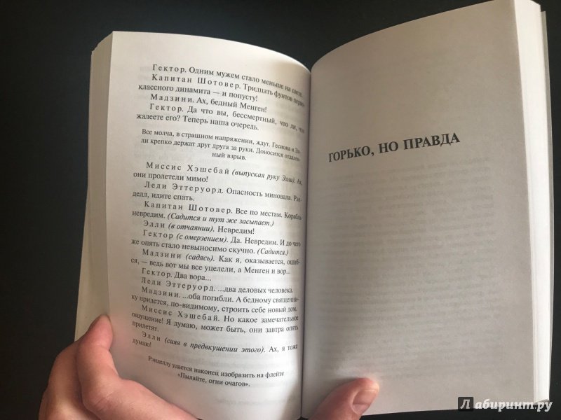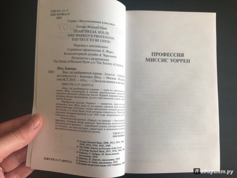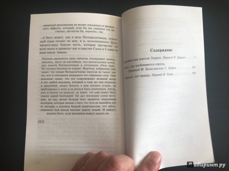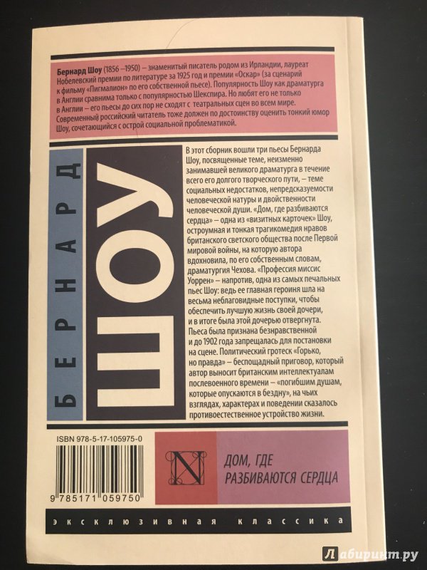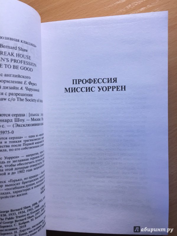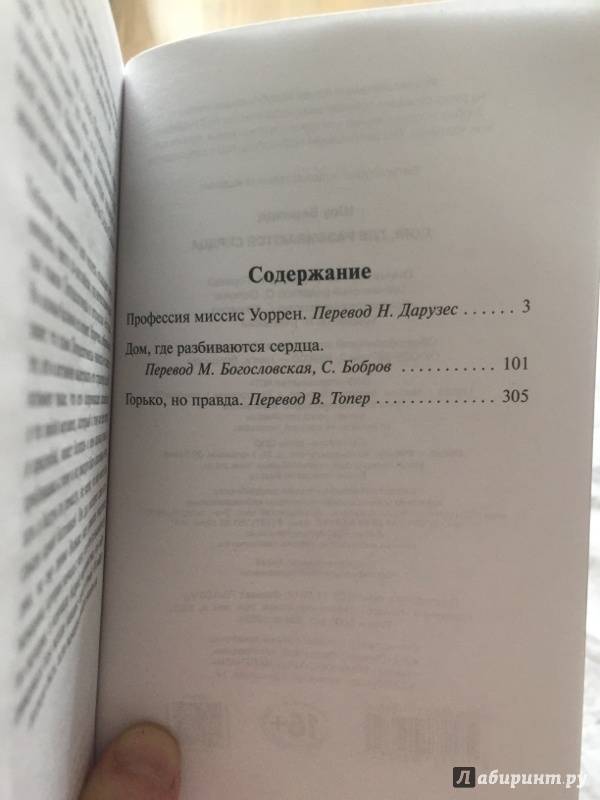 ОписаниеВ этот сборник вошли три пьесы Бернарда Шоу, посвященных теме, неизменно занимавшей великого драматурга в течение всего его долгого творческого пути, - теме социальных недостатков, непредсказуемости человеческой натуры и двойственности человеческой души. "Дом, где разбиваются сердца" - одна из "визитных карточек" Шоу, остроумная и тонкая трагикомедия нравов британского светского общества после Первой мировой войны, на которую автора вдохновила, по его собственным словам, драматургия Чехова. "Профессия миссис Уоррен" - напротив, одна из самых печальных пьес Шоу: ведь ее заглавная героиня шла на весьма неблаговидные поступки, чтобы обеспечить лучшую жизнь своей дочери, и в итоге была этой дочерью отвергнута. Пьеса была признана безнравственной и до 1902 года запрещалась для постановки на сцене. Политический гротеск "Горько, но правда" - беспощадный приговор, который автор выносит британским интеллектуалам послевоенного времени -"погибшим душам, которые опускаются в бездну", на чьих взглядах, характерах и поведении сказалось противоестественное устройство жизни.СвернутьВ этот сборник вошли три пьесы Бернарда Шоу, посвященных теме, неизменно занимавшей великого драматурга в течение всего его долгого творческого пути, - теме социальных недостатков, непредсказуемости человеческой натуры и двойственности человеческой души. "Дом, где разбиваются сердца" - одна из "визитных карточек" Шоу, остроумная и тонкая трагикомедия нравов британского светского общества после Первой мировой войны, на которую автора вдохновила, по его собственным словам, драматургия Чехова. "Профессия миссис Уоррен" - напротив, одна из самых печальных пьес Шоу: ведь ее заглавная героиня шла на весьма неблаговидные поступки, чтобы обеспечить лучшую жизнь своей дочери, и в итоге была этой дочерью отвергнута. Пьеса была признана безнравственной и до 1902 года запрещалась для постановки на сцене. Политический гротеск "Горько, но правда" - беспощадный приговор, который автор выносит британским интеллектуалам послевоенного времени -"погибшим душам, которые опускаются в бездну", на чьих взглядах, характерах и поведении сказалось противоестественное устройство жизни.СвернутьСвернуть