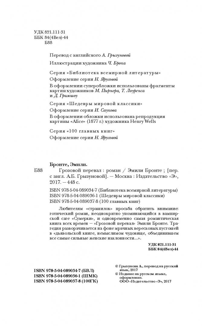 ОписаниеЛюбителям "страшилок" просьба обратить внимание: готический роман, неоднократно упоминающийся в вампирской саге "Сумерки", и одновременно самая романтическая книга всех времен - "Грозовой перевал" Эмили Бронте. Трагедия разворачивается на фоне мрачных вересковых пустошей в "дьявольской книге, немыслимом чудовище, объединившем все самые сильные женские наклонности…".Любителям "страшилок" просьба обратить внимание: готический роман, неоднократно упоминающийся в вампирской саге "Сумерки", и одновременно самая романтическая книга всех времен - "Грозовой перевал" Эмили Бронте. Трагедия разворачивается на фоне мрачных вересковых пустошей в "дьявольской книге, немыслимом чудовище, объединившем все самые сильные женские наклонности…".