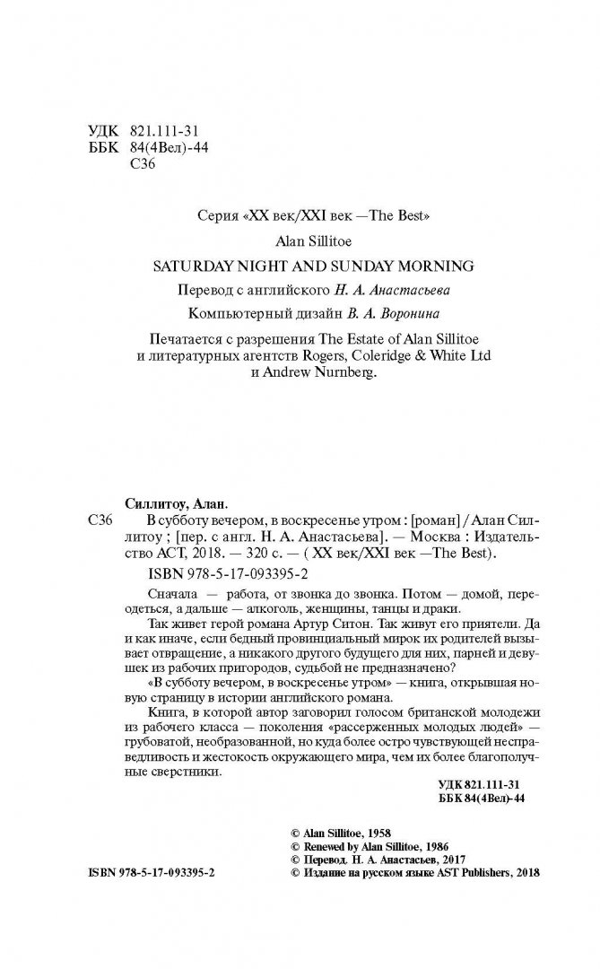 ОписаниеСначала - работа, от звонка до звонка. Потом - домой, переодеться, а дальше - алкоголь, женщины, танцы и драки. Так живет герой романа Артур Ситон. Так живут его приятели. Да и как иначе, если бедный провинциальный мирок их родителей вызывает отвращение, а никакого другого будущего для них, парней и девушек из рабочих пригородов, судьбой не предназначено? "В субботу вечером, в воскресенье утром" - книга, открывшая новую страницу в истории английского романа. Книга, в которой автор заговорил голосом британской молодежи из рабочего класса - поколения "рассерженных молодых людей" - грубоватой, необразованной, но куда более остро чувствующей несправедливость и жестокость окружающего мира, чем их более благополучные сверстники.Сначала - работа, от звонка до звонка. Потом - домой, переодеться, а дальше - алкоголь, женщины, танцы и драки. Так живет герой романа Артур Ситон. Так живут его приятели. Да и как иначе, если бедный провинциальный мирок их родителей вызывает отвращение, а никакого другого будущего для них, парней и девушек из рабочих пригородов, судьбой не предназначено? "В субботу вечером, в воскресенье утром" - книга, открывшая новую страницу в истории английского романа. Книга, в которой автор заговорил голосом британской молодежи из рабочего класса - поколения "рассерженных молодых людей" - грубоватой, необразованной, но куда более остро чувствующей несправедливость и жестокость окружающего мира, чем их более благополучные сверстники.