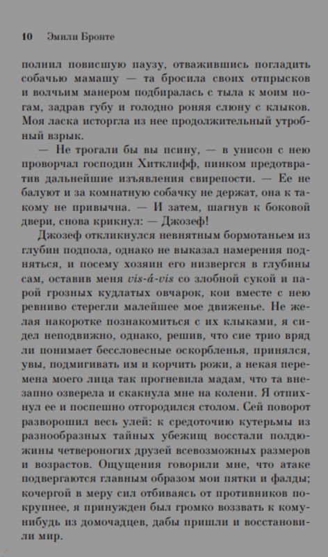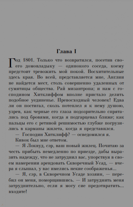 ОписаниеЕдинственный роман Эмили Бронте, который был признан во всем мире как главная романтическая книга всех времен. Но это не история любви Ромео и Джульетты в Йоркширских топях, это история мести. Хитклифф - главный герой романа - одержим Кэтрин, он озлоблен и мстителен, месть его распространяется не только на тех, кто, как он считает, разрушил его жизнь, но и на их детей. "Грозовой перевал" - золотая классика мировой литературы, роман мощный, страстный, трагичный, перевернувший в свое время представление о романтической прозе.Единственный роман Эмили Бронте, который был признан во всем мире как главная романтическая книга всех времен. Но это не история любви Ромео и Джульетты в Йоркширских топях, это история мести. Хитклифф - главный герой романа - одержим Кэтрин, он озлоблен и мстителен, месть его распространяется не только на тех, кто, как он считает, разрушил его жизнь, но и на их детей. "Грозовой перевал" - золотая классика мировой литературы, роман мощный, страстный, трагичный, перевернувший в свое время представление о романтической прозе.