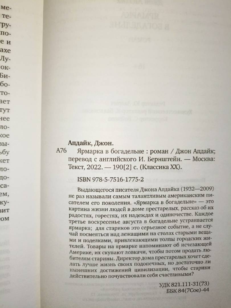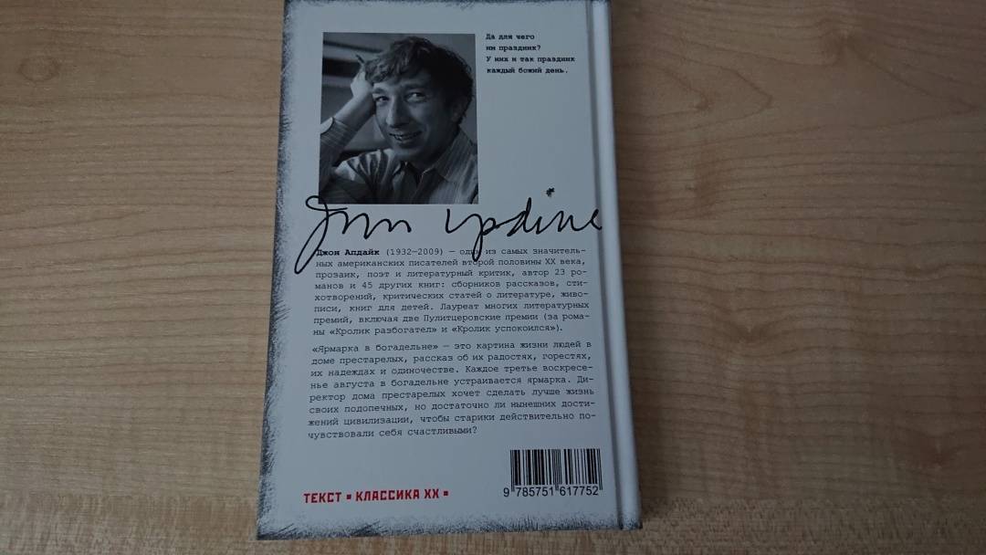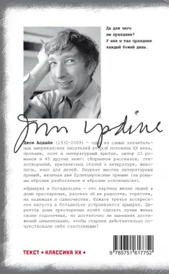 ОписаниеДа для чего им праздник? У них и так праздник каждый божий день.Джон АпдайкВыдающегося писателя Джона Апдайка (1932-2009) не раз называли самым талантливым американским писателем его поколения."Ярмарка в богадельне" - это картина жизни людей в доме престарелых, рассказ об их радостях, горестях, их надеждах и одиночестве. Каждое третье воскресенье августа в богадельне устраивается ярмарка; для стариков это серьезное событие, а не случай посмеяться над лежащими на столах старыми вещами и поделками, привлекающими толпы городских жителей. Товары на ярмарке напоминают об исчезающей Америке, их скупают ловкачи, чтобы потом продать любителям старины. Директор дома престарелых хочет сделать лучше жизнь своих подопечных, но достаточно ли нынешних достижений цивилизации, чтобы старики действительно почувствовали себя счастливыми?Джон Апдайк (1932-2009) - один из самых значительных американских писателей второй половины XX века, прозаик, поэт и литературный критик, автор 23 романов и 45 других книг: сборников рассказов, стихотворений, критических статей о литературе, живописи, книг для детей. Лауреат многих литературных премий, включая две Пулитцеровские премии (за романы "Кролик разбогател" и "Кролик успокоился").СвернутьДа для чего им праздник? У них и так праздник каждый божий день.Джон АпдайкВыдающегося писателя Джона Апдайка (1932-2009) не раз называли самым талантливым американским писателем его поколения."Ярмарка в богадельне" - это картина жизни людей в доме престарелых, рассказ об их радостях, горестях, их надеждах и одиночестве. Каждое третье воскресенье августа в богадельне устраивается ярмарка; для стариков это серьезное событие, а не случай посмеяться над лежащими на столах старыми вещами и поделками, привлекающими толпы городских жителей. Товары на ярмарке напоминают об исчезающей Америке, их скупают ловкачи, чтобы потом продать любителям старины. Директор дома престарелых хочет сделать лучше жизнь своих подопечных, но достаточно ли нынешних достижений цивилизации, чтобы старики действительно почувствовали себя счастливыми?Джон Апдайк (1932-2009) - один из самых значительных американских писателей второй половины XX века, прозаик, поэт и литературный критик, автор 23 романов и 45 других книг: сборников рассказов, стихотворений, критических статей о литературе, живописи, книг для детей. Лауреат многих литературных премий, включая две Пулитцеровские премии (за романы "Кролик разбогател" и "Кролик успокоился").СвернутьСвернуть