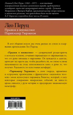 ОписаниеВ этот сборник вошли два очень разных по стилю и содержанию произведения Лео Перуца."Прыжок в неизвестное" - сатирический роман-притча о молодом человеке, отчаянно скрывающем от окружающих то, что его руки закованы в наручники. Он нуждается в деньгах, проходит все круги ада, чтобы раздобыть их, но снова и снова наталкивается на стену невозможности взять в руки то, что получил. Реальность это или тонкая метафора?.."Парикмахер Тюрлюпэн", в свою очередь, ироничное и остроумное произведение о французском "маленьком человеке" эпохи всемогущего кардинала Ришелье, который, в силу некоторых совершенно невероятных событий, на какое-то время оказался у руля истории и предупредил национальную катастрофу.В этот сборник вошли два очень разных по стилю и содержанию произведения Лео Перуца."Прыжок в неизвестное" - сатирический роман-притча о молодом человеке, отчаянно скрывающем от окружающих то, что его руки закованы в наручники. Он нуждается в деньгах, проходит все круги ада, чтобы раздобыть их, но снова и снова наталкивается на стену невозможности взять в руки то, что получил. Реальность это или тонкая метафора?.."Парикмахер Тюрлюпэн", в свою очередь, ироничное и остроумное произведение о французском "маленьком человеке" эпохи всемогущего кардинала Ришелье, который, в силу некоторых совершенно невероятных событий, на какое-то время оказался у руля истории и предупредил национальную катастрофу.