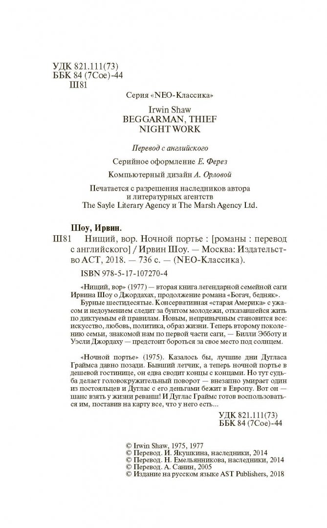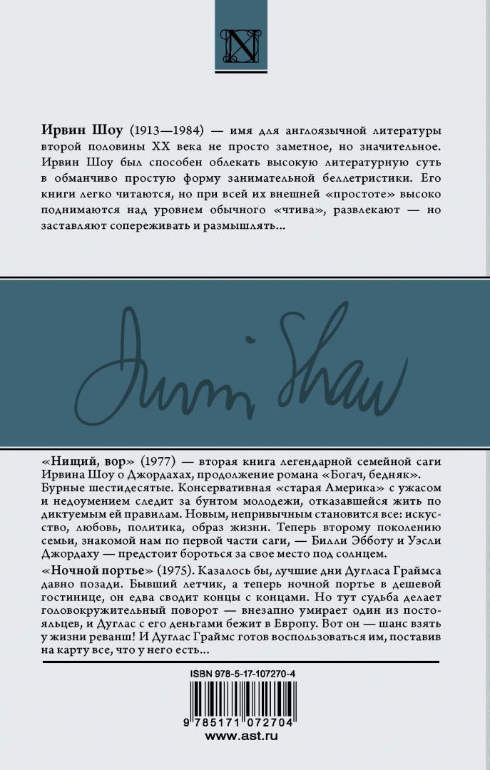 --Ирвин Шоу: Нищий, вор. Ночной портьеРусская классическая и современная литератураДетектив. Остросюжетная литератураЗарубежная художественная литератураРусская художественная литератураФэнтезиДраматургияПоэзияПриключенияФантастикаЭпос и фольклорКлассическая прозаАфоризмыИсторическая прозаДетективыБасниСентиментальная прозаОтечественный боевикСовременная прозаМолодежная литератураЗарубежная классическая и современная литература