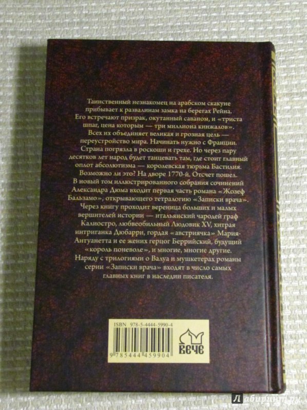 ОписаниеВ очередной том иллюстрированного собрания сочинений Александра Дюма входит заключительная часть романа "Жозеф Бальзамо", открывающего тетралогию "Записки врача". Через книгу проходит вереница больших и малых вершителей истории - итальянский чародей граф Калиостро, любвеобильный Людовик XV, хитрая интриганка Дюбарри, гордая "австриячка" Мария-Антуанетта и ее жених герцог Беррийский, будущий "король поневоле", и многие, многие другие. Наряду с трилогиями о Валуа и мушкетерах романы серии "Записки врача" входят в число самых главных книг в наследии писателя.В очередной том иллюстрированного собрания сочинений Александра Дюма входит заключительная часть романа "Жозеф Бальзамо", открывающего тетралогию "Записки врача". Через книгу проходит вереница больших и малых вершителей истории - итальянский чародей граф Калиостро, любвеобильный Людовик XV, хитрая интриганка Дюбарри, гордая "австриячка" Мария-Антуанетта и ее жених герцог Беррийский, будущий "король поневоле", и многие, многие другие. Наряду с трилогиями о Валуа и мушкетерах романы серии "Записки врача" входят в число самых главных книг в наследии писателя.