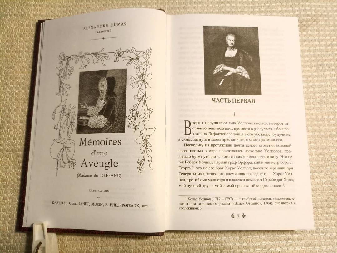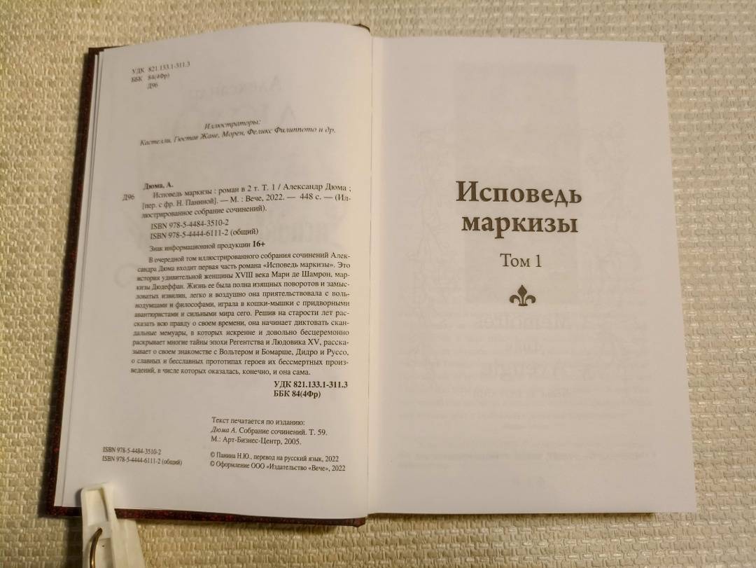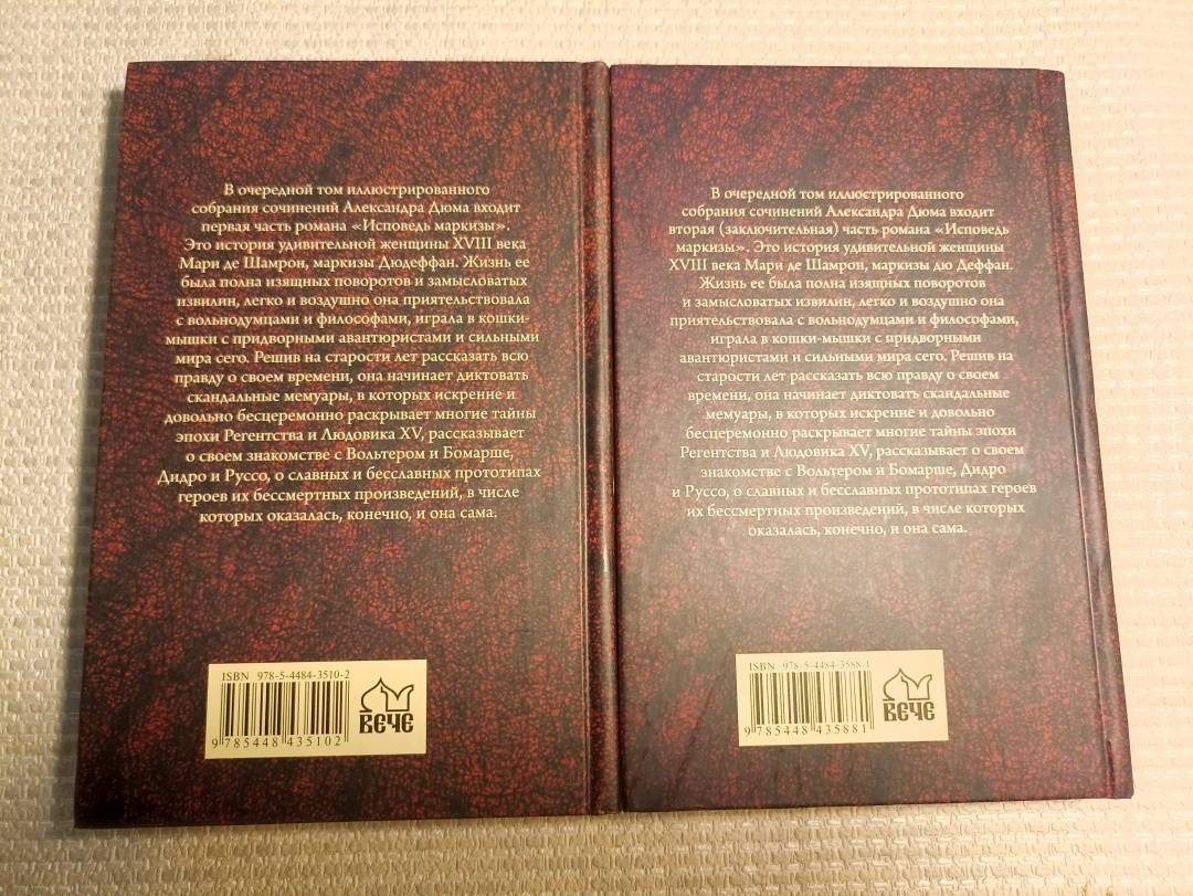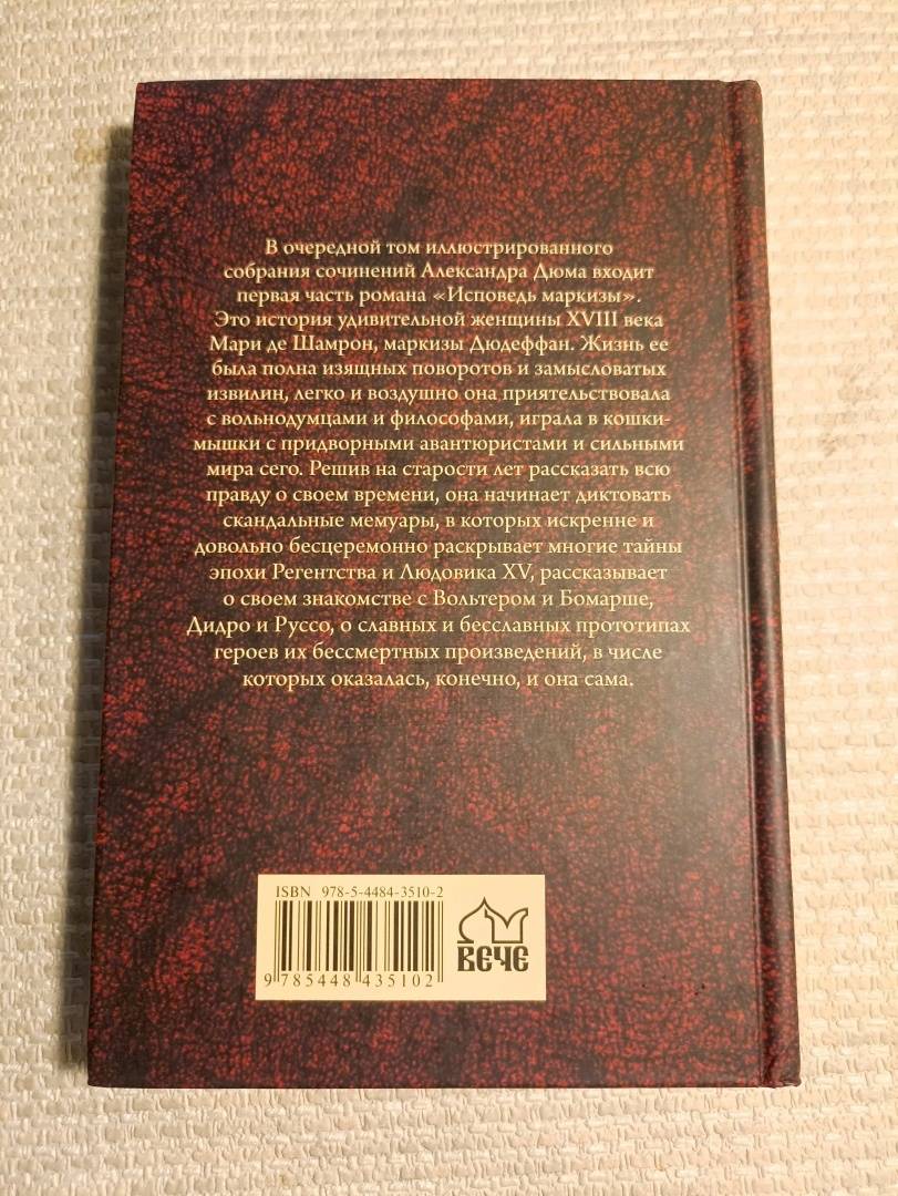 ОписаниеВ очередной том иллюстрированного собрания сочинений Александра Дюма входит первая часть роман "Исповедь маркизы". Это история удивительной женщины XVIII века Мари де Шамрон, маркизы Дюдеффан. Жизнь ее была полна изящных поворотов и замысловатых извилин, легко и воздушно она приятельствовала с вольнодумцами и философами, играла в кошки-мышки с придворными авантюристами и сильными мира сего. Решив на старости лет рассказать всю правду о своем времени, она начинает диктовать скандальные мемуары, в которых искренне и довольно бесцеремонно раскрывает многие тайны эпохи Регентства и Людовика XV, рассказывает о своем знакомстве с Вольтером и Бомарше, Дидро и Руссо, о славных и бесславных прототипах героев их бессмертных произведений, в числе которых оказалась, конечно, и она сама.В очередной том иллюстрированного собрания сочинений Александра Дюма входит первая часть роман "Исповедь маркизы". Это история удивительной женщины XVIII века Мари де Шамрон, маркизы Дюдеффан. Жизнь ее была полна изящных поворотов и замысловатых извилин, легко и воздушно она приятельствовала с вольнодумцами и философами, играла в кошки-мышки с придворными авантюристами и сильными мира сего. Решив на старости лет рассказать всю правду о своем времени, она начинает диктовать скандальные мемуары, в которых искренне и довольно бесцеремонно раскрывает многие тайны эпохи Регентства и Людовика XV, рассказывает о своем знакомстве с Вольтером и Бомарше, Дидро и Руссо, о славных и бесславных прототипах героев их бессмертных произведений, в числе которых оказалась, конечно, и она сама.