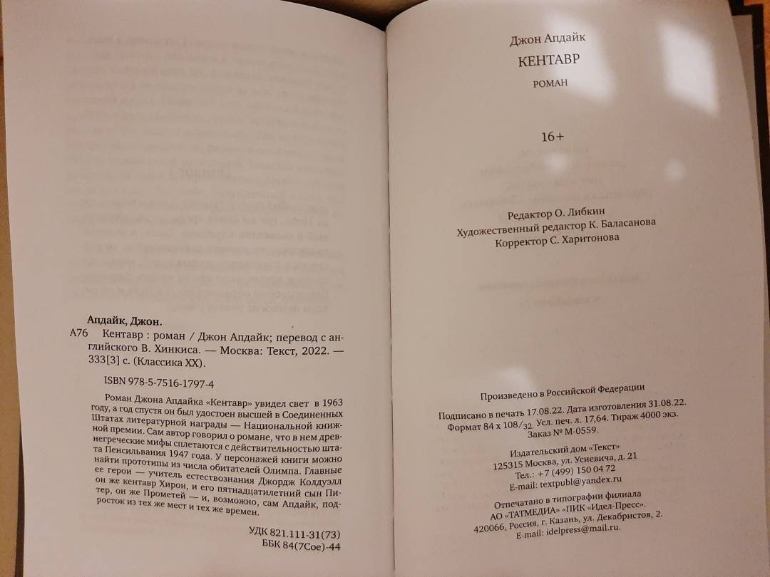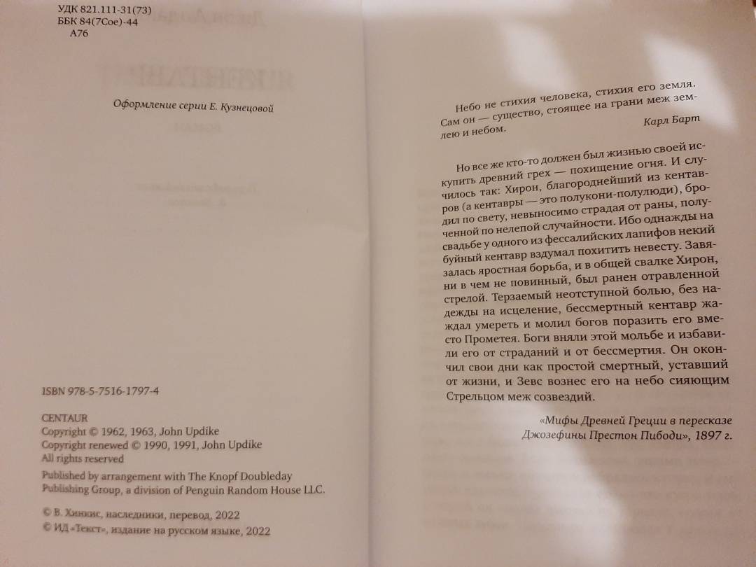 ОписаниеДжон Апдайк (1932-2009) - один из самых значительных американских писателей второй половины XX века, прозаик, поэт и литературный критик, автор 23 романов и 45 других книг: сборников рассказов, стихотворений, критических статей о литературе, живописи, книг для детей. Лауреат многих литературных премий, включая две Пулитцеровские премии (за романы "Кролик разбогател" и "Кролик успокоился").Роман Джона Апдайка "Кентавр" увидел свет в 1963, когда Джону Апдайку было 32 года, а год спустя он был удостоен высшей в Соединенных Штатах литературной награды - Национальной книжной премии. Сам автор говорил о романе, что в нем древнегреческие мифы сплетаются с действительностью небольшого городка штата Пенсильвания 1947 года.У персонажей книги можно найти прототипы из числа обитателей Олимпа. В главном герое, школьном учителе естествознания Джордже Колдуэлле угадывается кентавр Хирон, сын Кроноса, изначально наделенный бессмертием, а в его сыне Питере - Прометей, которому, согласно преданию, Хирон отдает свое бессмертие. И, возможно, сам Апдайк, подросток из тех же мест и тех же времен.У одних есть способности, у других - нет. Но у каждого есть что-нибудь, пусть даже иногда только жизнь. Милосердный Бог не для того нас создал, чтобы мы жалели о том, чего у нас нет. Человек с двумя талантами не должен завидовать человеку с пятью. Посмотри на нас с Питером. У меня нет ни одного таланта, а у него десять. Но я на него не в претензии. Я его люблю. Он мой сын.Джон АпдайкСвернутьДжон Апдайк (1932-2009) - один из самых значительных американских писателей второй половины XX века, прозаик, поэт и литературный критик, автор 23 романов и 45 других книг: сборников рассказов, стихотворений, критических статей о литературе, живописи, книг для детей. Лауреат многих литературных премий, включая две Пулитцеровские премии (за романы "Кролик разбогател" и "Кролик успокоился").Роман Джона Апдайка "Кентавр" увидел свет в 1963, когда Джону Апдайку было 32 года, а год спустя он был удостоен высшей в Соединенных Штатах литературной награды - Национальной книжной премии. Сам автор говорил о романе, что в нем древнегреческие мифы сплетаются с действительностью небольшого городка штата Пенсильвания 1947 года.У персонажей книги можно найти прототипы из числа обитателей Олимпа. В главном герое, школьном учителе естествознания Джордже Колдуэлле угадывается кентавр Хирон, сын Кроноса, изначально наделенный бессмертием, а в его сыне Питере - Прометей, которому, согласно преданию, Хирон отдает свое бессмертие. И, возможно, сам Апдайк, подросток из тех же мест и тех же времен.У одних есть способности, у других - нет. Но у каждого есть что-нибудь, пусть даже иногда только жизнь. Милосердный Бог не для того нас создал, чтобы мы жалели о том, чего у нас нет. Человек с двумя талантами не должен завидовать человеку с пятью. Посмотри на нас с Питером. У меня нет ни одного таланта, а у него десять. Но я на него не в претензии. Я его люблю. Он мой сын.Джон АпдайкСвернутьСвернуть