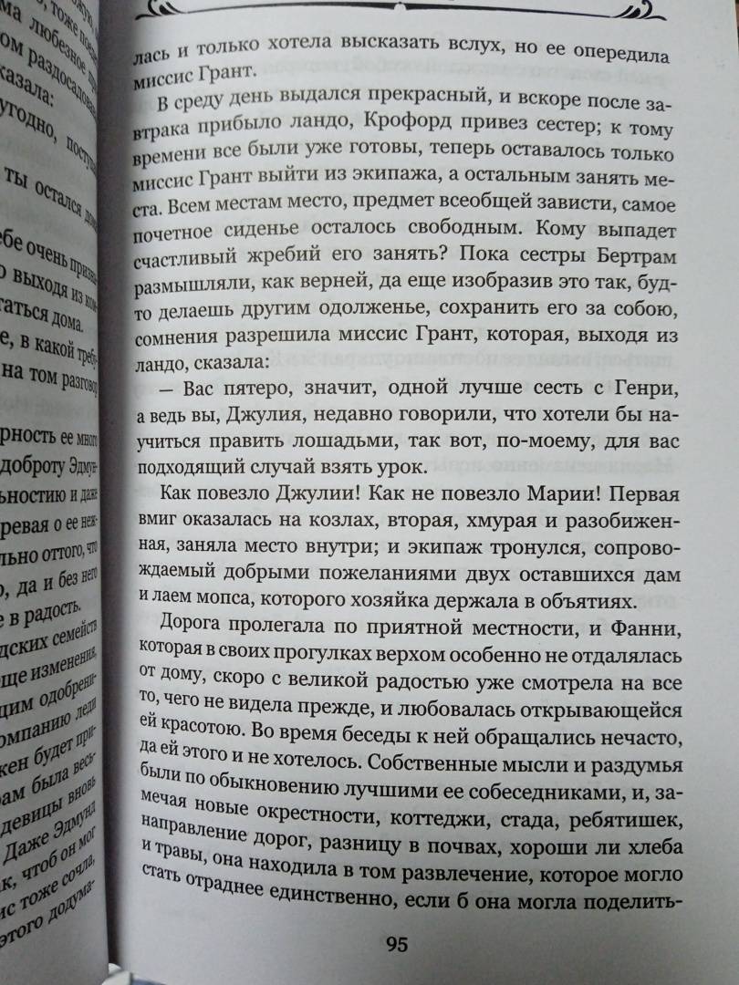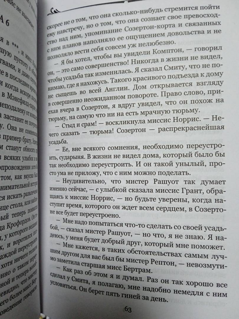 ОписаниеАнглия начала XIX века. Фанни — девочка из небогатой семьи — оказывается в поместье своих богатых родственников, где она живет и воспитывается не один год и вступает в пору юности. Считается, что сам факт пребывания в таком избранном обществе открывает для Фанни широкие перспективы, но в действительности она — бесправная приживалка, и перспектив у нее нет никаких. Ее способности недооцениваются, ее мнение не учитывается. Все, на что она может рассчитывать, это стать компаньонкой для какой-нибудь обеспеченной леди, то есть сделаться чужой тенью. И даже выгодное замужество не позволит юной Фанни свободно выбирать свою дорогу в жизни, если это замужество будет не по любви.Так начинается роман знаменитой английской писательницы Джейн Остин (1775—1817), оцененный многими поколениями читателей за психологически точный портрет главной героини, чей образ весьма типичен для своей эпохи.Англия начала XIX века. Фанни — девочка из небогатой семьи — оказывается в поместье своих богатых родственников, где она живет и воспитывается не один год и вступает в пору юности. Считается, что сам факт пребывания в таком избранном обществе открывает для Фанни широкие перспективы, но в действительности она — бесправная приживалка, и перспектив у нее нет никаких. Ее способности недооцениваются, ее мнение не учитывается. Все, на что она может рассчитывать, это стать компаньонкой для какой-нибудь обеспеченной леди, то есть сделаться чужой тенью. И даже выгодное замужество не позволит юной Фанни свободно выбирать свою дорогу в жизни, если это замужество будет не по любви.Так начинается роман знаменитой английской писательницы Джейн Остин (1775—1817), оцененный многими поколениями читателей за психологически точный портрет главной героини, чей образ весьма типичен для своей эпохи.