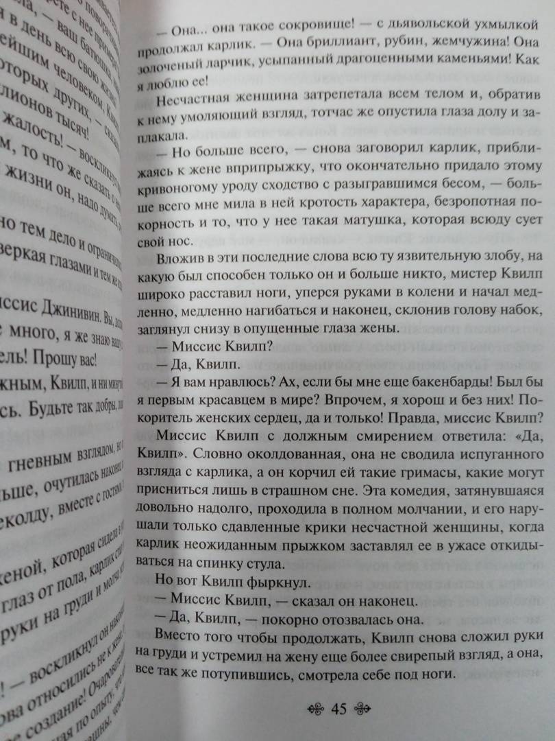 ОписаниеВ двенадцать лет от роду Чарльз Джон Хаффам Диккенс (1812-1870), старший из шестерых детей бедного клерка Джона Диккенса, отправился на работу на фабрику ваксы в Хангерфорд-Стерз на Стрэнде. Страшна была не столько мучительная бедность, сколько унижение - грязная работа вместо школьных занятий, отец в долговой тюрьме... Именно тогда родилась решимость выбраться из нищеты и неизвестности, вместе с несомненным актерским даром, блестящей памятью и неуемным воображением сделавшая Диккенса самым знаменитым писателем Англии. От фабричного рабочего до признанного героя литературного мира, - "большие надежды" Чарльза Диккенса счастливо осуществились."Лавка древностей" - это переплетение реалистического повествования и сказки с элементами готики, "причудливыми", "странными и гротескными" персонажами, мрачными тайнами. В романе о Нелл, маленькой девочке "бесконечно милого нрава", ее деде, выжившем из ума картежнике-мечтателе, и преследующем их жестоком карлике, ростовщике Квилпе - вечная тема противостояния добра и зла. Один из самых трогательных романов Чарльза Диккенса.СвернутьВ двенадцать лет от роду Чарльз Джон Хаффам Диккенс (1812-1870), старший из шестерых детей бедного клерка Джона Диккенса, отправился на работу на фабрику ваксы в Хангерфорд-Стерз на Стрэнде. Страшна была не столько мучительная бедность, сколько унижение - грязная работа вместо школьных занятий, отец в долговой тюрьме... Именно тогда родилась решимость выбраться из нищеты и неизвестности, вместе с несомненным актерским даром, блестящей памятью и неуемным воображением сделавшая Диккенса самым знаменитым писателем Англии. От фабричного рабочего до признанного героя литературного мира, - "большие надежды" Чарльза Диккенса счастливо осуществились."Лавка древностей" - это переплетение реалистического повествования и сказки с элементами готики, "причудливыми", "странными и гротескными" персонажами, мрачными тайнами. В романе о Нелл, маленькой девочке "бесконечно милого нрава", ее деде, выжившем из ума картежнике-мечтателе, и преследующем их жестоком карлике, ростовщике Квилпе - вечная тема противостояния добра и зла. Один из самых трогательных романов Чарльза Диккенса.СвернутьСвернуть