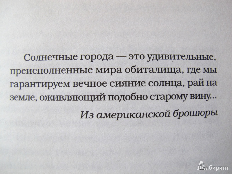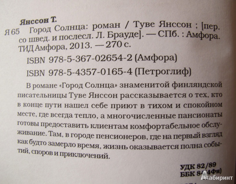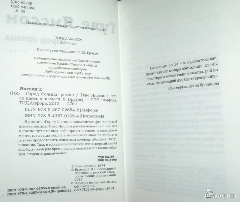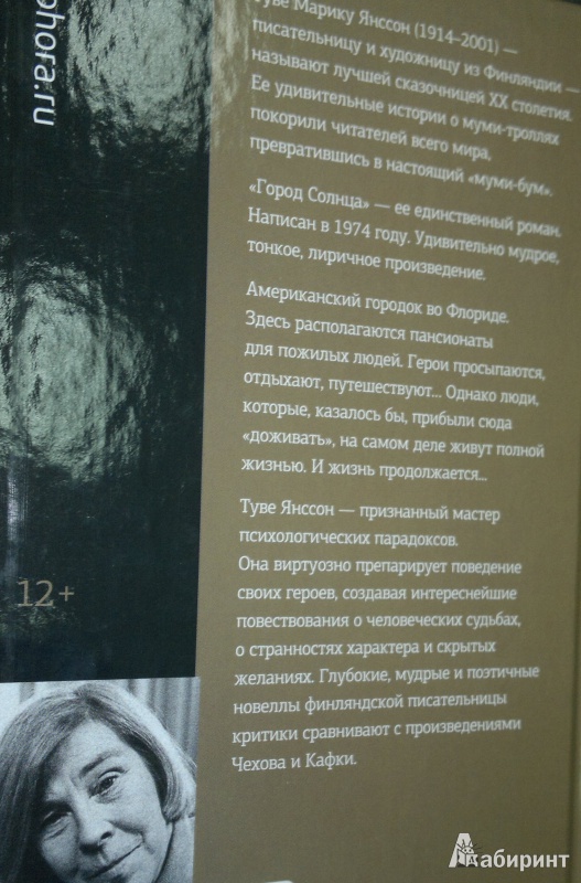 ОписаниеВ романе "Город Солнца" знаменитой финляндской писательницы Туве Янссон рассказывается о тех, кто в конце пути нашел себе приют в тихом и спокойном месте, где всегда тепло, а многочисленные пансионаты готовы предоставить клиентам комфортабельное обслуживание. Там, в городе пенсионеров, где на первый взгляд как будто замерло время, жизнь оказывается полна событий, споров и приключений.В романе "Город Солнца" знаменитой финляндской писательницы Туве Янссон рассказывается о тех, кто в конце пути нашел себе приют в тихом и спокойном месте, где всегда тепло, а многочисленные пансионаты готовы предоставить клиентам комфортабельное обслуживание. Там, в городе пенсионеров, где на первый взгляд как будто замерло время, жизнь оказывается полна событий, споров и приключений.