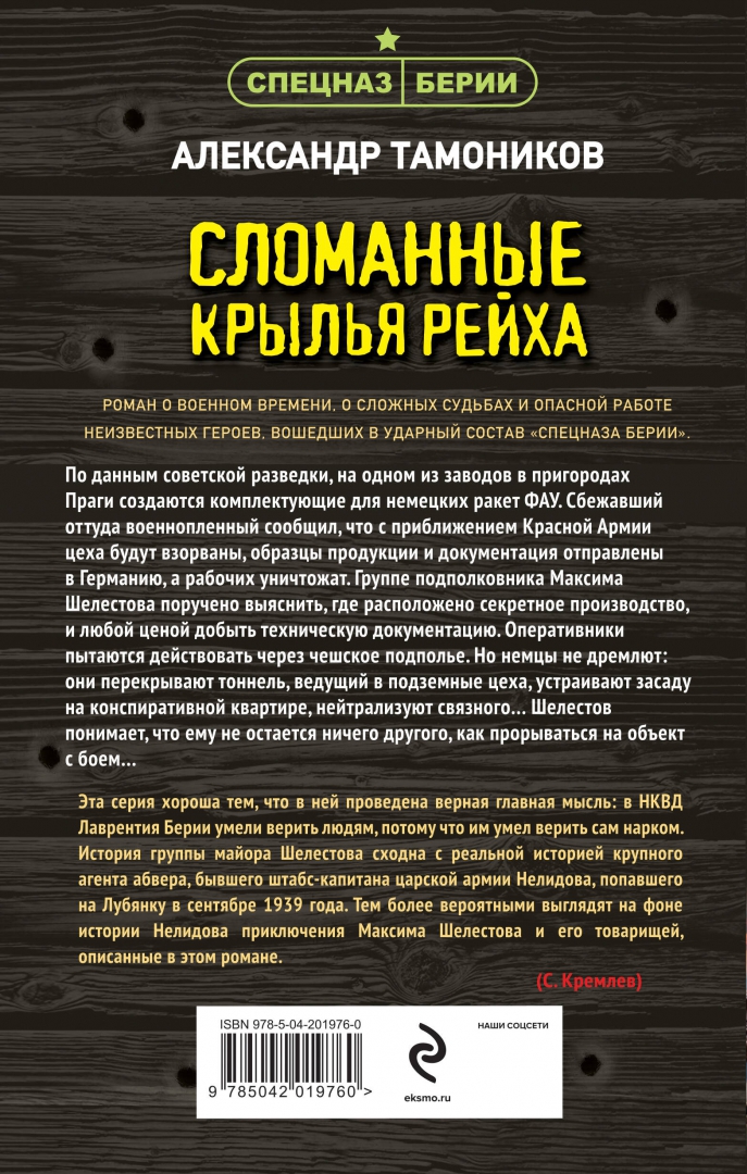 ОписаниеРоман о военном времени, о сложных судьбах и опасной работе неизвестных героев, вошедших в ударный состав «спецназа Берии». По данным советской разведки, на одном из заводов в пригородах Праги создаются комплектующие для немецких ракет ФАУ. Сбежавший оттуда военнопленный сообщил, что с приближением Красной Армии цеха будут взорваны, образцы продукции и документация отправлены в Германию, а рабочих уничтожат. Группе подполковника Максима Шелестова поручено выяснить, где расположено секретное производство, и любой ценой добыть техническую документацию. Оперативники пытаются действовать через чешское подполье. Но немцы не дремлют: они перекрывают тоннель, ведущий в подземные цеха, устраивают засаду на конспиративной квартире, нейтрализуют связного… Шелестов понимает, что ему не остается ничего другого, как прорываться на объект с боем… «Эта серия хороша тем, что в ней проведена верная главная мысль: в НКВД Лаврентия Берии умели верить людям, потому что им умел верить сам нарком. История группы майора Шелестова сходна с реальной историей крупного агента абвера, бывшего штабс-капитана царской армии Нелидова, попавшего на Лубянку в сентябре 1939 года. Тем более вероятными выглядят на фоне истории Нелидова приключения Максима Шелестова и его товарищей, описанные в этом романе». — С. Кремлев Общий тираж книг А. Тамоникова — более 10 миллионов экземпляров.СвернутьРоман о военном времени, о сложных судьбах и опасной работе неизвестных героев, вошедших в ударный состав «спецназа Берии». По данным советской разведки, на одном из заводов в пригородах Праги создаются комплектующие для немецких ракет ФАУ. Сбежавший оттуда военнопленный сообщил, что с приближением Красной Армии цеха будут взорваны, образцы продукции и документация отправлены в Германию, а рабочих уничтожат. Группе подполковника Максима Шелестова поручено выяснить, где расположено секретное производство, и любой ценой добыть техническую документацию. Оперативники пытаются действовать через чешское подполье. Но немцы не дремлют: они перекрывают тоннель, ведущий в подземные цеха, устраивают засаду на конспиративной квартире, нейтрализуют связного… Шелестов понимает, что ему не остается ничего другого, как прорываться на объект с боем… «Эта серия хороша тем, что в ней проведена верная главная мысль: в НКВД Лаврентия Берии умели верить людям, потому что им умел верить сам нарком. История группы майора Шелестова сходна с реальной историей крупного агента абвера, бывшего штабс-капитана царской армии Нелидова, попавшего на Лубянку в сентябре 1939 года. Тем более вероятными выглядят на фоне истории Нелидова приключения Максима Шелестова и его товарищей, описанные в этом романе». — С. Кремлев Общий тираж книг А. Тамоникова — более 10 миллионов экземпляров.СвернутьСвернуть