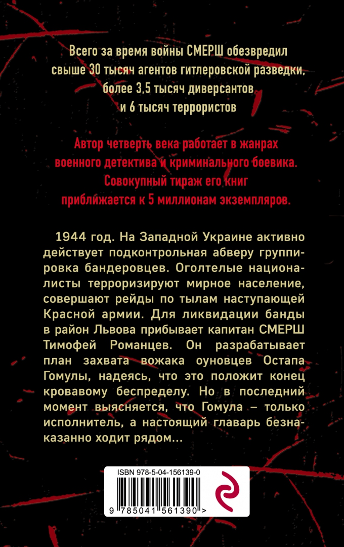 ОписаниеАвтор четверть века работает в жанрах военного детектива и криминального боевика. Совокупный тираж его книг приближается к 5 миллионам экземпляров.1944 год. На Западной Украине активно действует подконтрольная абверу группировка бандеровцев. Оголтелые националисты терроризируют мирное население, совершают рейды по тылам наступающей Красной Армии. Для ликвидации банды в район Львова прибывает капитан СМЕРШа Тимофей Романцев. Он разрабатывает план захвата вожака оуновцев Остапа Гомулы, надеясь, что это положит конец кровавому беспределу. Но в последний момент выясняется, что Гомула - только исполнитель, а настоящий главарь безнаказанно ходит рядом…Автор четверть века работает в жанрах военного детектива и криминального боевика. Совокупный тираж его книг приближается к 5 миллионам экземпляров.1944 год. На Западной Украине активно действует подконтрольная абверу группировка бандеровцев. Оголтелые националисты терроризируют мирное население, совершают рейды по тылам наступающей Красной Армии. Для ликвидации банды в район Львова прибывает капитан СМЕРШа Тимофей Романцев. Он разрабатывает план захвата вожака оуновцев Остапа Гомулы, надеясь, что это положит конец кровавому беспределу. Но в последний момент выясняется, что Гомула - только исполнитель, а настоящий главарь безнаказанно ходит рядом…