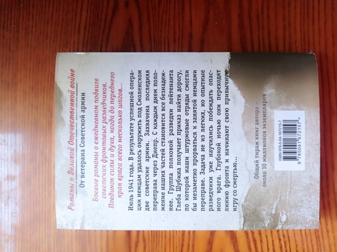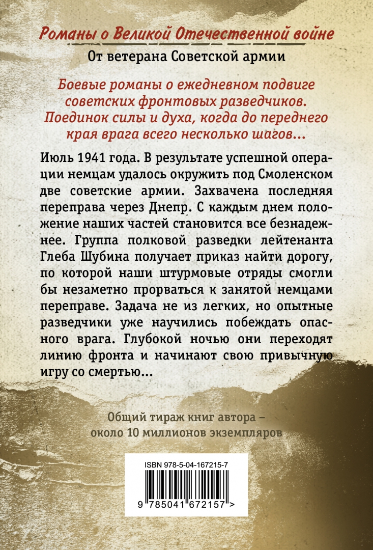 ОписаниеОт их смекалки и отваги зависела судьба фронтовых операций. Боевые романы о ежедневном подвиге советских фронтовых разведчиков. Поединок силы и духа, когда до переднего края врага всего несколько шагов… Общий тираж книг автора - около 10 миллионов экземпляров. Июль 1941 года. В результате успешной операции немцам удалось окружить под Смоленском две советские армии. Захвачена последняя переправа через Днепр. С каждым днем положение наших частей становится все безнадежнее. Группа полковой разведки лейтенанта Глеба Шубина получает приказ найти дорогу, по которой наши штурмовые отряды смогли бы незаметно прорваться к занятой немцами переправе. Задача не из легких, но опытные разведчики уже научились побеждать опасного врага. Глубокой ночью они переходят линию фронта и начинают свою привычную игру со смертью…От их смекалки и отваги зависела судьба фронтовых операций. Боевые романы о ежедневном подвиге советских фронтовых разведчиков. Поединок силы и духа, когда до переднего края врага всего несколько шагов… Общий тираж книг автора - около 10 миллионов экземпляров. Июль 1941 года. В результате успешной операции немцам удалось окружить под Смоленском две советские армии. Захвачена последняя переправа через Днепр. С каждым днем положение наших частей становится все безнадежнее. Группа полковой разведки лейтенанта Глеба Шубина получает приказ найти дорогу, по которой наши штурмовые отряды смогли бы незаметно прорваться к занятой немцами переправе. Задача не из легких, но опытные разведчики уже научились побеждать опасного врага. Глубокой ночью они переходят линию фронта и начинают свою привычную игру со смертью…