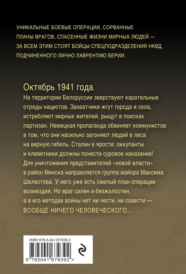 ОписаниеРоман о военном времени, о сложных судьбах и опасной работе неизвестных героев, вошедших в ударный состав «спецназа Берии». Общий тираж книг А. Тамоникова — около 10 миллионов экземпляров. «Эта книга хороша тем, что в ней проведена верная главная мысль: в НКВД Лаврентия Берии умели верить людям, потому что им умел верить сам нарком. История группы майора Шелестова сходна с реальной историей крупного агента абвера, бывшего штабс-капитана царской армии Нелидова, попавшего на Лубянку в сентябре 1939 года. Тем более вероятными выглядят на фоне истории Нелидова приключения Максима Шелестова и его товарищей, описанные в этом романе». — С. Кремлев Октябрь 1941 года. На территории Белоруссии зверствуют карательные отряды нацистов. Захватчики жгут города и села, истребляют мирных жителей, рыщут в поисках партизан. Немецкая пропаганда обвиняет коммунистов в том, что они насильно загоняют людей в леса на верную гибель. Сталин в ярости: оккупанты и клеветники должны понести суровое наказание! Для уничтожения представителей «новой власти» в район Минска направляется группа майора Максима Шелестова. У него уже есть смелый план операции возмездия. Но враг силен и безжалостен, а в его методах войны нет ни чести, ни совести — вообще ничего человеческого…СвернутьРоман о военном времени, о сложных судьбах и опасной работе неизвестных героев, вошедших в ударный состав «спецназа Берии». Общий тираж книг А. Тамоникова — около 10 миллионов экземпляров. «Эта книга хороша тем, что в ней проведена верная главная мысль: в НКВД Лаврентия Берии умели верить людям, потому что им умел верить сам нарком. История группы майора Шелестова сходна с реальной историей крупного агента абвера, бывшего штабс-капитана царской армии Нелидова, попавшего на Лубянку в сентябре 1939 года. Тем более вероятными выглядят на фоне истории Нелидова приключения Максима Шелестова и его товарищей, описанные в этом романе». — С. Кремлев Октябрь 1941 года. На территории Белоруссии зверствуют карательные отряды нацистов. Захватчики жгут города и села, истребляют мирных жителей, рыщут в поисках партизан. Немецкая пропаганда обвиняет коммунистов в том, что они насильно загоняют людей в леса на верную гибель. Сталин в ярости: оккупанты и клеветники должны понести суровое наказание! Для уничтожения представителей «новой власти» в район Минска направляется группа майора Максима Шелестова. У него уже есть смелый план операции возмездия. Но враг силен и безжалостен, а в его методах войны нет ни чести, ни совести — вообще ничего человеческого…СвернутьСвернуть