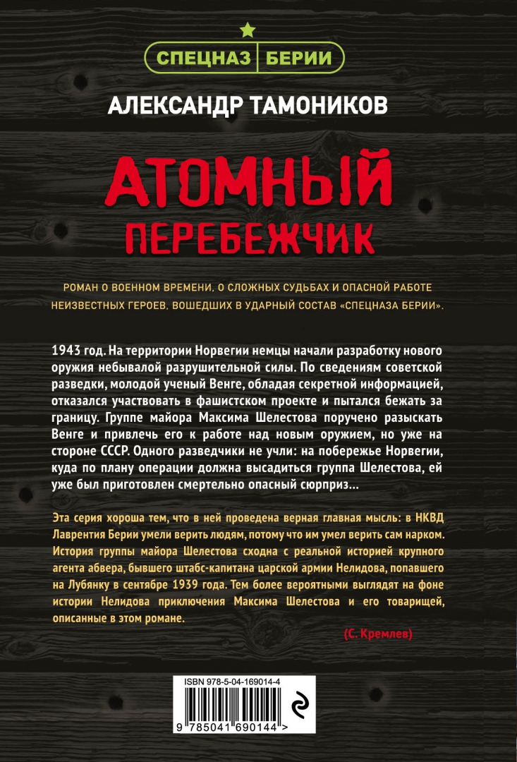 ОписаниеРоман о военном времени, о сложных судьбах и опасной работе неизвестных героев, вошедших в ударный состав "спецназа Берии". 1943 год. На территории Норвегии немцы начали разработку нового оружия небывалой разрушительной силы. По сведениям советской разведки, молодой ученый Венге, обладая секретной информацией, отказался участвовать в фашистском проекте и пытался бежать за границу. Группе майора Максима Шелестова поручено разыскать Венге и привлечь его к работе над новым оружием, но уже на стороне СССР. Одного разведчики не учли: на побережье Норвегии, куда по плану операции должна высадиться группа Шелестова, ей уже был приготовлен смертельно опасный сюрприз... "Эта серия хороша тем, что в ней проведена верная главная мысль: в НКВД Лаврентия Берии умели верить людям, потому что им умел верить сам нарком. История группы майора Шелестова сходна с реальной историей крупного агента абвера, бывшего штабс-капитана царской армии Нелидова, попавшего на Лубянку в сентябре 1939 года. Тем более вероятными выглядят на фоне истории Нелидова приключения Максима Шелестова и его товарищей, описанные в этом романе".(С. Кремлев) Общий тираж книг А. Тамоникова - более 10 миллионов экземпляров.СвернутьРоман о военном времени, о сложных судьбах и опасной работе неизвестных героев, вошедших в ударный состав "спецназа Берии". 1943 год. На территории Норвегии немцы начали разработку нового оружия небывалой разрушительной силы. По сведениям советской разведки, молодой ученый Венге, обладая секретной информацией, отказался участвовать в фашистском проекте и пытался бежать за границу. Группе майора Максима Шелестова поручено разыскать Венге и привлечь его к работе над новым оружием, но уже на стороне СССР. Одного разведчики не учли: на побережье Норвегии, куда по плану операции должна высадиться группа Шелестова, ей уже был приготовлен смертельно опасный сюрприз... "Эта серия хороша тем, что в ней проведена верная главная мысль: в НКВД Лаврентия Берии умели верить людям, потому что им умел верить сам нарком. История группы майора Шелестова сходна с реальной историей крупного агента абвера, бывшего штабс-капитана царской армии Нелидова, попавшего на Лубянку в сентябре 1939 года. Тем более вероятными выглядят на фоне истории Нелидова приключения Максима Шелестова и его товарищей, описанные в этом романе".(С. Кремлев) Общий тираж книг А. Тамоникова - более 10 миллионов экземпляров.СвернутьСвернуть