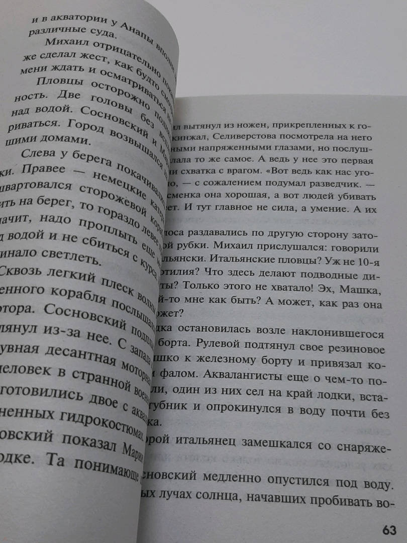 ОписаниеРоман о военном времени, о сложных судьбах и опасной работе неизвестных героев, вошедших в ударный состав «спецназа Берии». Сентябрь 1942 года. Новороссийск захвачен фашистами. Предприятия города эвакуированы. В акватории порта советскими инженерами тайно затоплен образец новейшей торпеды. Немцы, узнав об этом, начали активные поиски, чтобы наладить собственное производство этого мощного оружия. Опередить противника, найти и уничтожить торпеду поручено группе майора Максима Шелестова. Бойцы пробираются в оккупированный город, надеясь разыскать единственного оставшегося в живых участника затопления. Они не предполагают, что у этой тайны есть еще один свидетель… «Эта серия хороша тем, что в ней проведена верная главная мысль: в НКВД Лаврентия Берии умели верить людям, потому что им умел верить сам нарком. История группы майора Шелестова сходна с реальной историей крупного агента абвера, бывшего штабс-капитана царской армии Нелидова, попавшего на Лубянку в сентябре 1939 года. Тем более вероятными выглядят на фоне истории Нелидова приключения Максима Шелестова и его товарищей, описанные в этом романе». — С. Кремлев Общий тираж книг А. Тамоникова — более 10 миллионов экземпляров.СвернутьРоман о военном времени, о сложных судьбах и опасной работе неизвестных героев, вошедших в ударный состав «спецназа Берии». Сентябрь 1942 года. Новороссийск захвачен фашистами. Предприятия города эвакуированы. В акватории порта советскими инженерами тайно затоплен образец новейшей торпеды. Немцы, узнав об этом, начали активные поиски, чтобы наладить собственное производство этого мощного оружия. Опередить противника, найти и уничтожить торпеду поручено группе майора Максима Шелестова. Бойцы пробираются в оккупированный город, надеясь разыскать единственного оставшегося в живых участника затопления. Они не предполагают, что у этой тайны есть еще один свидетель… «Эта серия хороша тем, что в ней проведена верная главная мысль: в НКВД Лаврентия Берии умели верить людям, потому что им умел верить сам нарком. История группы майора Шелестова сходна с реальной историей крупного агента абвера, бывшего штабс-капитана царской армии Нелидова, попавшего на Лубянку в сентябре 1939 года. Тем более вероятными выглядят на фоне истории Нелидова приключения Максима Шелестова и его товарищей, описанные в этом романе». — С. Кремлев Общий тираж книг А. Тамоникова — более 10 миллионов экземпляров.СвернутьСвернуть