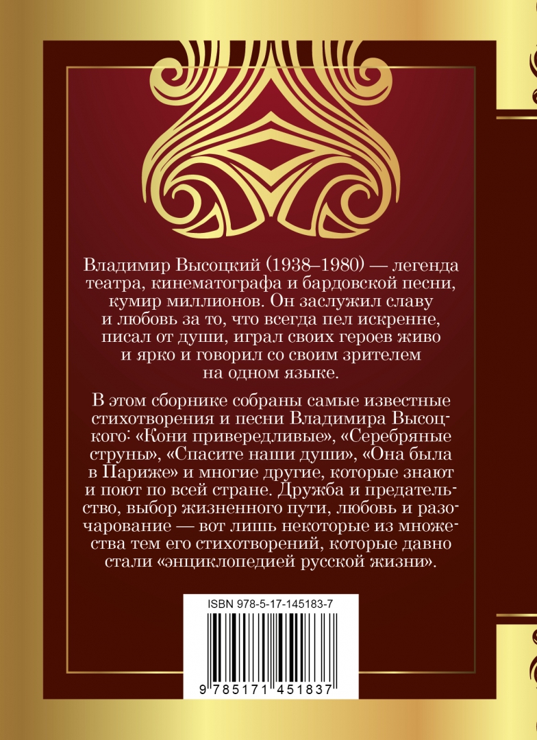 ОписаниеВладимир Высоцкий (1938–1980) — легенда театра, кинематографа и бардовской песни, кумир миллионов. Он заслужил славу и любовь за то, что всегда пел искренне, писал от души, играл своих героев живо и ярко и говорил со своим зрителем на одном языке.В этом сборнике собраны самые известные стихотворения и песни Владимира Высоцкого: «Кони привередливые», «Серебряные струны», «Спасите наши души», «Она была в Париже» и многие другие, которые знают и поют по всей стране. Дружба и предательство, выбор жизненного пути, любовь и разочарование — вот лишь некоторые из множества тем его стихотворений, которые давно стали «энциклопедией русской жизни».Лучшие стихотворения великого поэта и барда в одной книге