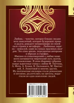 Любовь — чувство, которое близко людям всех поколений, которое будоражит кровь и разум, рождает потрясающие по своей силе строки и метафоры… Любовная лирика — пожалуй, один из самых красивых жанров. Это сама жизнь, переданная авторами в образах и строфах.Именно со стихотворений о любви чаще всего начинается творческий путь поэтов, их становление. В этом сборнике собраны самые известные стихи о любви Ф. Тютчева, А. Фета, А. Блока, К. Бальмонта, М. Цветаевой, А. Ахматовой и многих других. Их поэтические шедевры стали романсами и песнями, разлетелись на цитаты, вырастили не одно поколение людей.Самые известные стихи о любви поэтов Золотого и Серебряного века