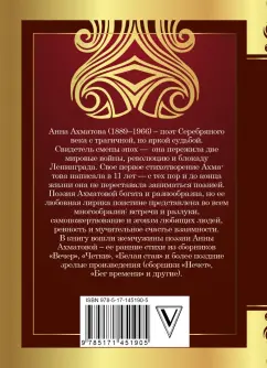 ОписаниеАнна Ахматова (1889-1966) - поэт Серебряного века с трагичной, но яркой судьбой. Свидетель смены эпох - она пережила две мировые войны, революцию и блокаду Ленинграда.Свое первое стихотворение Ахматова написала в 11 лет - с тех пор и до конца жизни она не переставала заниматься поэзией.Поэзия Ахматовой богата и разнообразна, но ее любовная лирика поистине представлена во всем многообразии: встречи и разлуки, самопожертвование и эгоизм любящих людей, ревность и мучительное счастье взаимности.В книгу вошли жемчужины поэзии Анны Ахматовой - ее ранние стихи из сборников "Вечер", "Четки", "Белая стая" и более поздние зрелые произведения (сборники "Нечет", "Бег времени" и другие).Анна Ахматова (1889-1966) - поэт Серебряного века с трагичной, но яркой судьбой. Свидетель смены эпох - она пережила две мировые войны, революцию и блокаду Ленинграда.Свое первое стихотворение Ахматова написала в 11 лет - с тех пор и до конца жизни она не переставала заниматься поэзией.Поэзия Ахматовой богата и разнообразна, но ее любовная лирика поистине представлена во всем многообразии: встречи и разлуки, самопожертвование и эгоизм любящих людей, ревность и мучительное счастье взаимности.В книгу вошли жемчужины поэзии Анны Ахматовой - ее ранние стихи из сборников "Вечер", "Четки", "Белая стая" и более поздние зрелые произведения (сборники "Нечет", "Бег времени" и другие).