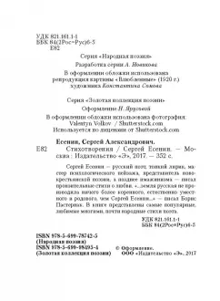 ОписаниеСергей Есенин - русский поэт, тонкий лирик, мастер психологического пейзажа, представитель новокрестьянской поэзии, а позднее имажинизма - писал пронзительные стихи о любви. "...земля русская не производила ничего более коренного, естественно уместного и родового, чем Сергей Есенин..." - писал Борис Пастернак. В книге представлены самые популярные, любимые многими, почти народные, стихи поэта.Сергей Есенин - русский поэт, тонкий лирик, мастер психологического пейзажа, представитель новокрестьянской поэзии, а позднее имажинизма - писал пронзительные стихи о любви. "...земля русская не производила ничего более коренного, естественно уместного и родового, чем Сергей Есенин..." - писал Борис Пастернак. В книге представлены самые популярные, любимые многими, почти народные, стихи поэта.