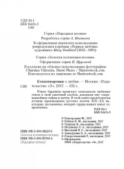 Объем, стр. 352 ISBN 978-5-699-98627-9 Серия Золотая коллекция поэзии Минимальный возраст 16+ Год издания книги 2017 Тип обложки Твердый переплет Иллюстрации Без иллюстраций Вес, г 202г Размеры 146х112х21 мм - Отзывы