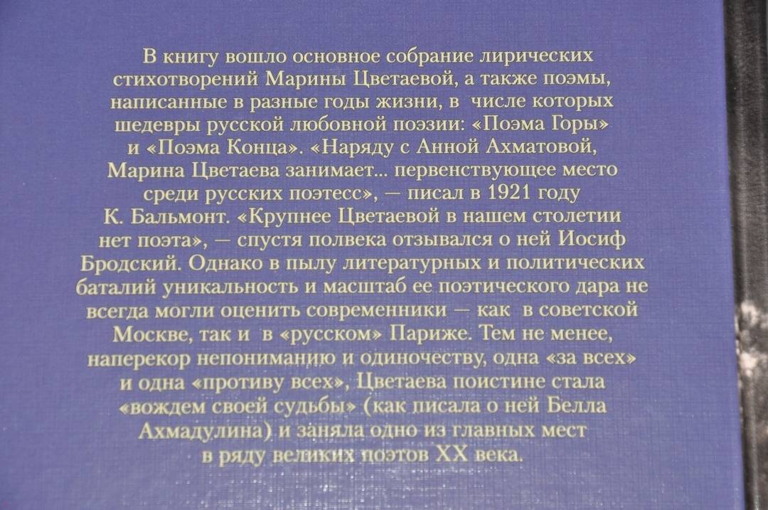 ОписаниеВ книгу вошло основное собрание лирических стихотворений Марины Цветаевой, а также поэмы, написанные в разные годы жизни, в числе которых шедевры русской любовной поэзии: «Поэма Горы» и «Поэма Конца». «Наряду с Анной Ахматовой, Марина Цветаева занимает… первенствующее место среди русских поэтесс», — писал в 1921 году К. Бальмонт. «Крупнее Цветаевой в нашем столетии нет поэта», – спустя полвека отзывался о ней Иосиф Бродский. Однако в пылу литературных и политических баталий уникальность и масштаб ее поэтического дара не всегда могли оценить современники – как в советской Москве, так и в «русском» Париже. Тем не менее, наперекор непониманию и одиночеству, одна «за всех» и одна «противу всех», Цветаева поистине стала «вождем своей судьбы» (как писала о ней Белла Ахмадулина) и заняла одно из главных мест в ряду великих поэтов ХХ века.